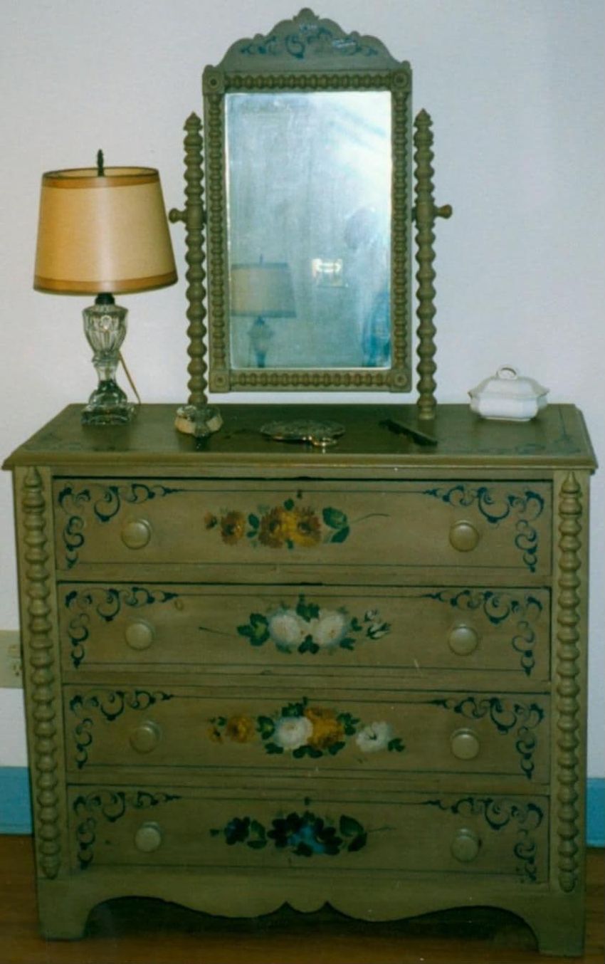 Wooden chest of drawers painted mustard yellow with floral and scroll stencil decoration on drawers and top, four equal size drawers with round wood pulls, turned pilasters on sides of front, reverse serpentine shaped skirt.