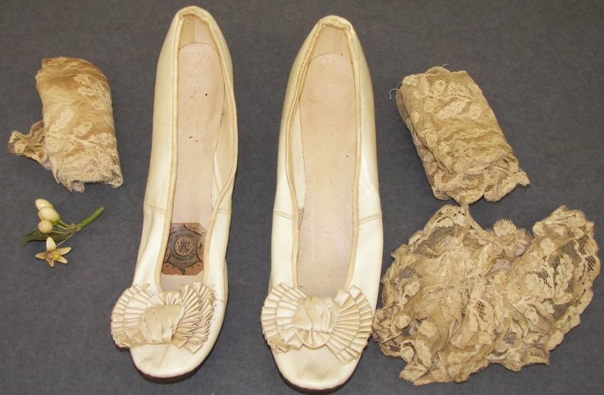 Pair of white leather shoes with heels and pleated satin bows (detached).