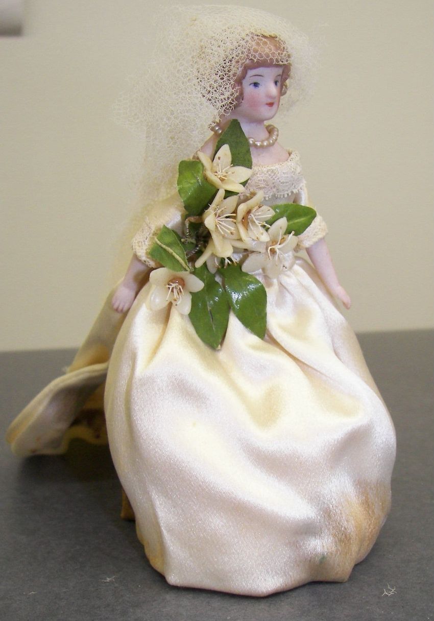 Small doll with porcelain face, hand and feet. Dressed in a white satin wedding dress with a lace collar, pearls, tulle veil and a bouquet of wax orange blossoms.