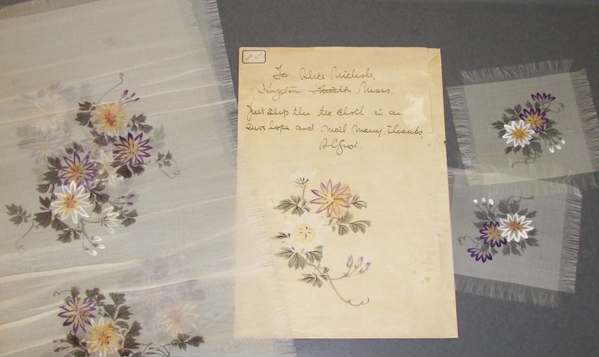 Paper envelope containing hand painted tea napkins and table runner, painted white and purple floral spray on front with handwritten note.