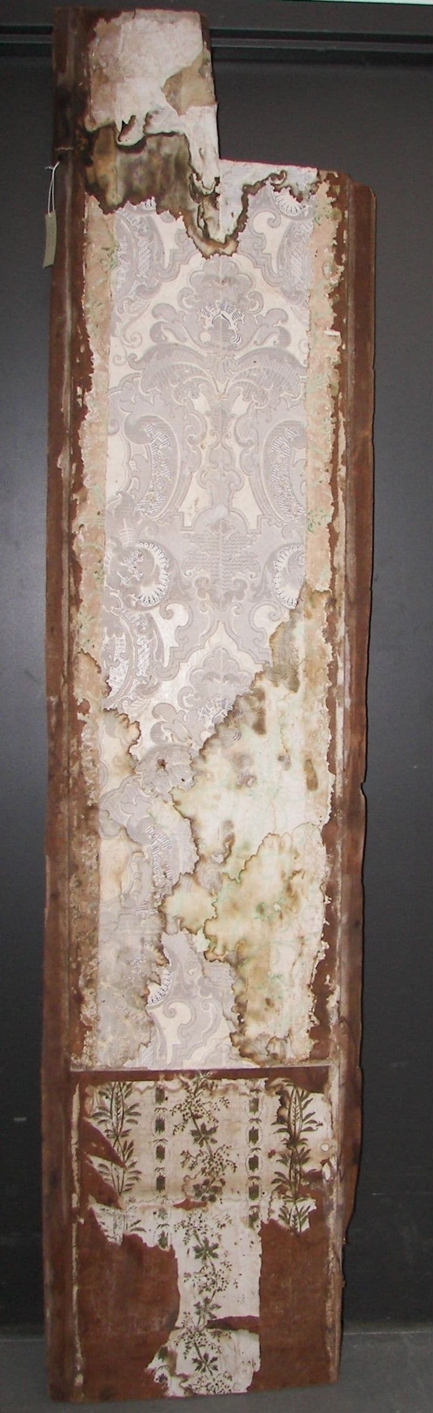 Portion of wall panel with multiple layers of wallpaper on both sides. Side 1: Top half of board has a gray foliate scroll pattern on white ground with blue accents partially covered by a pale green drapery swag patterned paper on white ground. Bottom half of board has a floral, berry, and leaf stri...