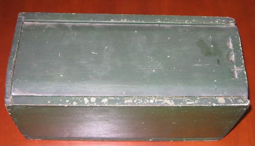 Wooden rectangular candle box painted green. Slide lid with three semicircle shaped finger grooves.