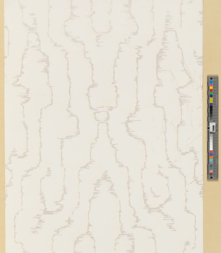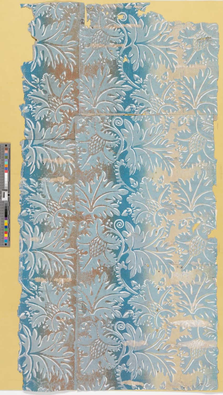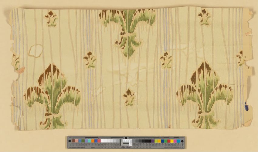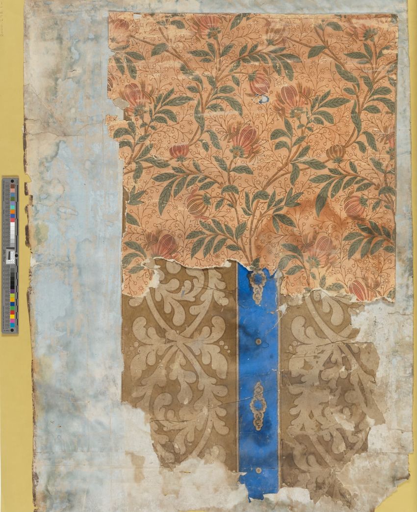 Wallpaper fragment. Anglo-Japanese style. Dense, overlapping foliage with flowers. Stylized flowers. Geometric framework of circles, triangles and squares. Printed in two greens, gold, black, silver-grey and magenta on a light olive ground.