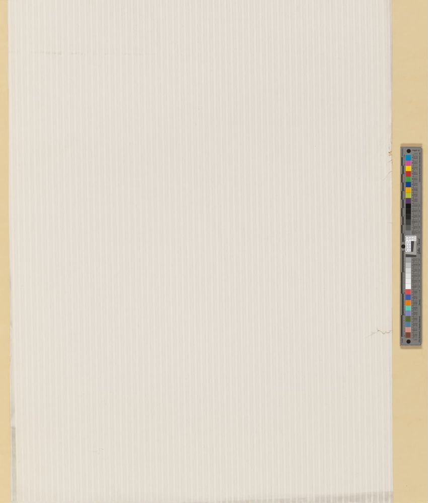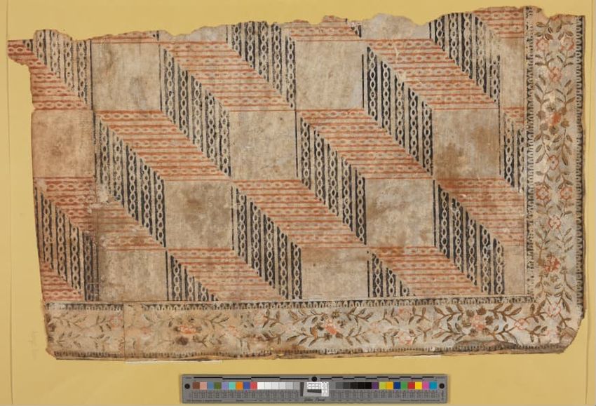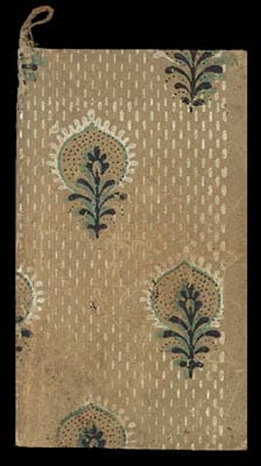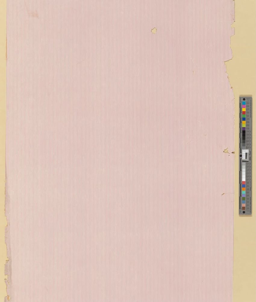 Wallpaper fragment. Anglo-Japanese style. Dense, overlapping foliage with flowers. Stylized flowers. Geometric framework of circles, triangles and squares. Printed in two greens, gold, black, silver-grey and magenta on a light olive ground.
