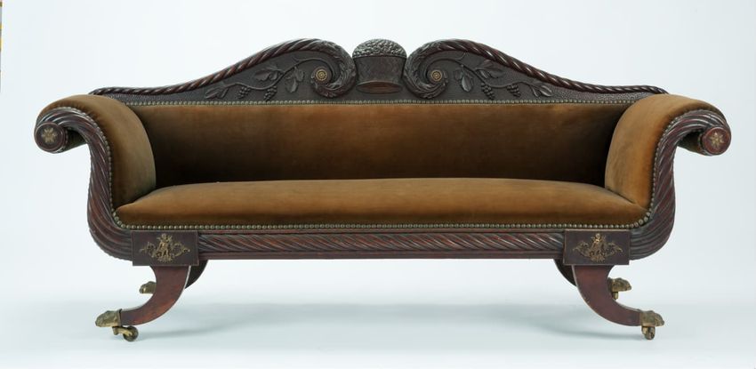 Sofa. Wood, brass. Serpentine carved crest with fruit basket motif, scrolled arms, carved seat rail. Rests on sabre legs with brass paw feet. Plaques above each leg have matching brass mounts featuring putti with floral garlands.