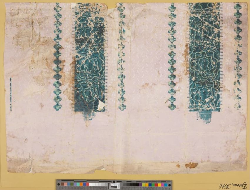 Wallpaper fragment. Imitation ikat or Chinese silk fabric. Prints in green, white on blue ground.