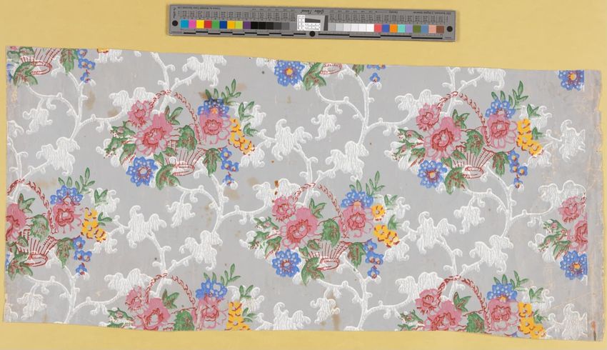 Wallpaper fragment. Red flower baskets with pink, blue and yellow flowers on a field of white meandering vines. Printed on polished grey ground. Straight match.