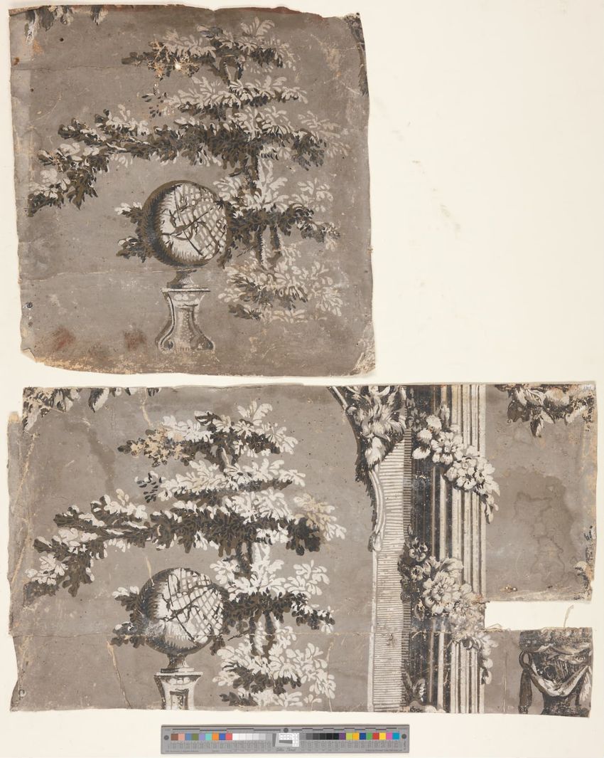 Fragments (3). Pillar and Arch paper. Pattern shows reeded columns with wrapping floral garland and globe on pedestal. Prints in brown, black, white on grey ground.
