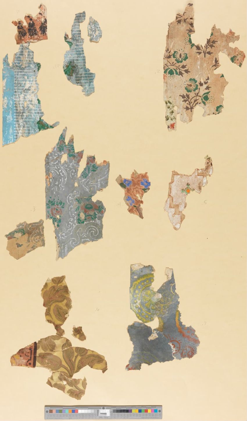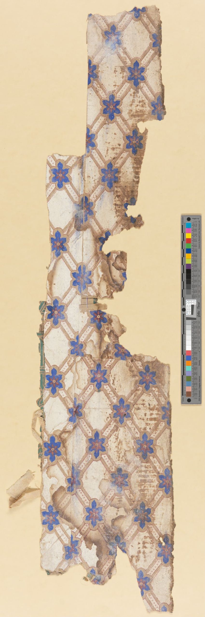 Wallpaper fragment of strapwork and floral paper. Printed in grey, two greens, red, pink, blue, yellow on white ground.
