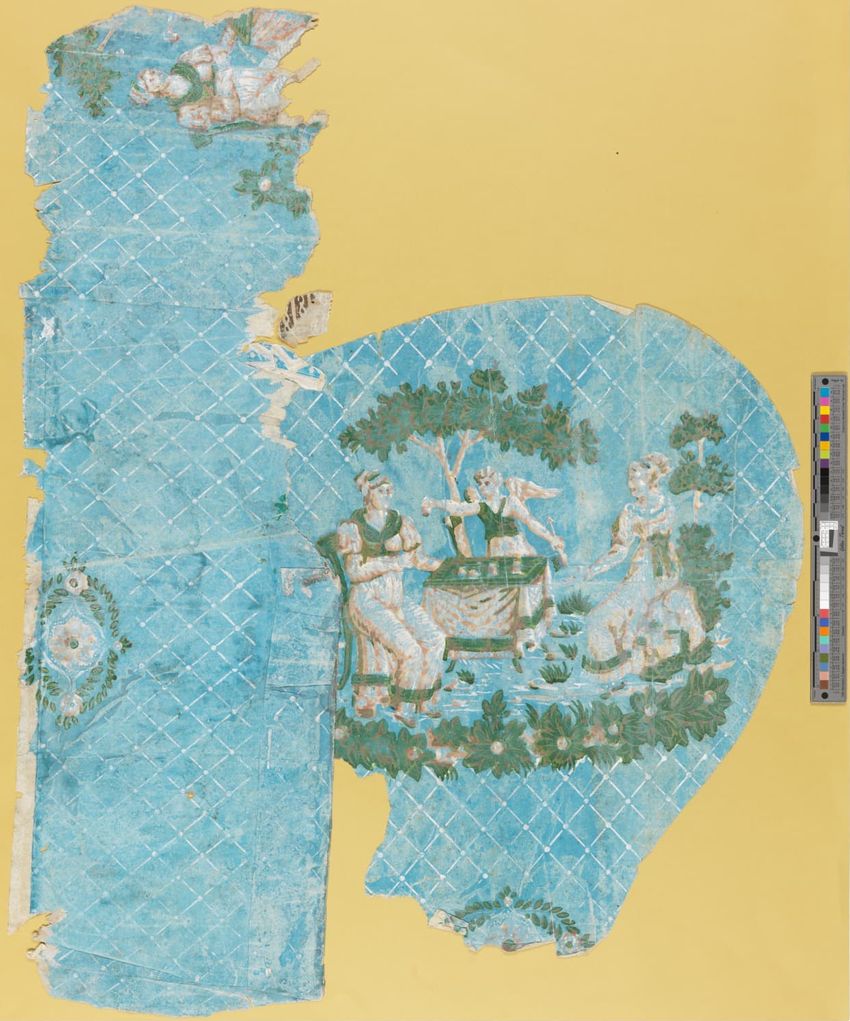 Two used fragments of landscape figure paper. Scene consists of two women seated at table (one possibly Psyche), being offered a gift by Cupid. Scene separated by laurel leaf (?) medallion inserted with rosette. Printed in green, brown, white with white diapered background on blue ground.
