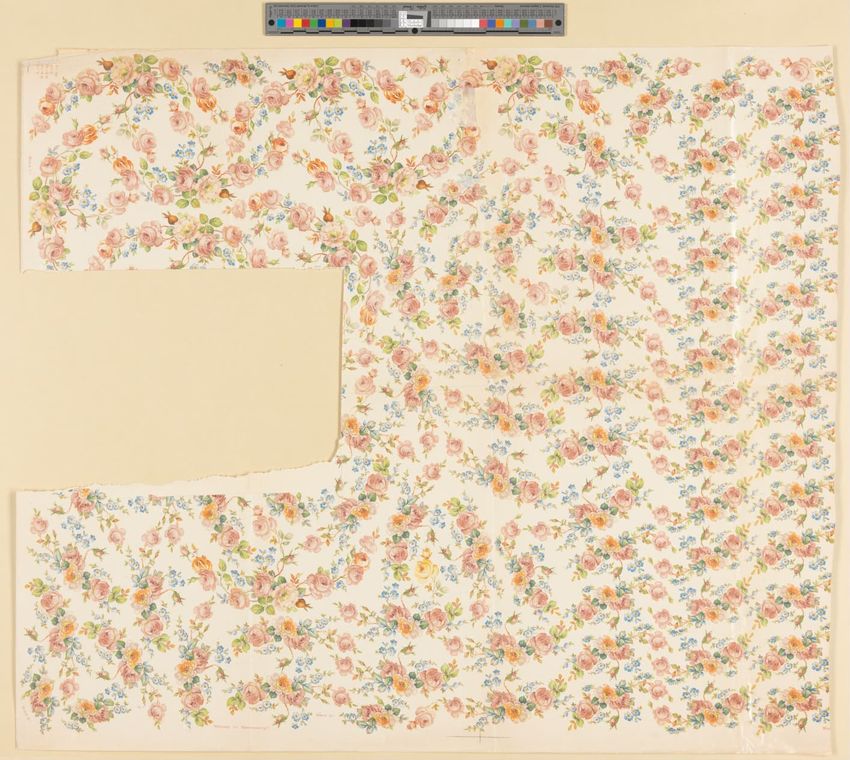 Wallpaper fragment. Allover stylized flowers on berried stems. Printed in brown, yellow and rose on a white ground.