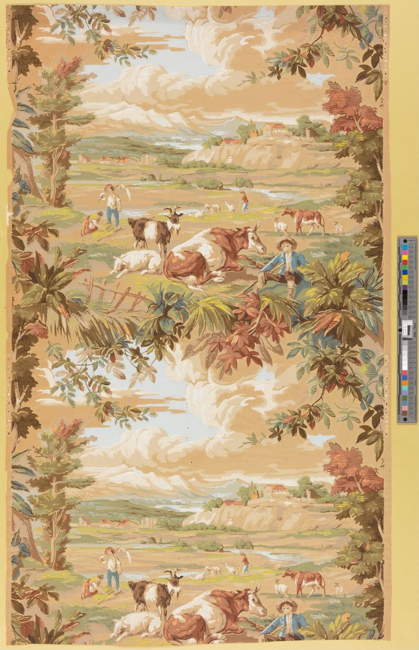 Unused samples of pastoral scenery figure paper. Repeating scene of four figures among goat, sheep and cows. Printed in five browns, orange, 3 blues, white, yellow, 5 greens on tan ground.