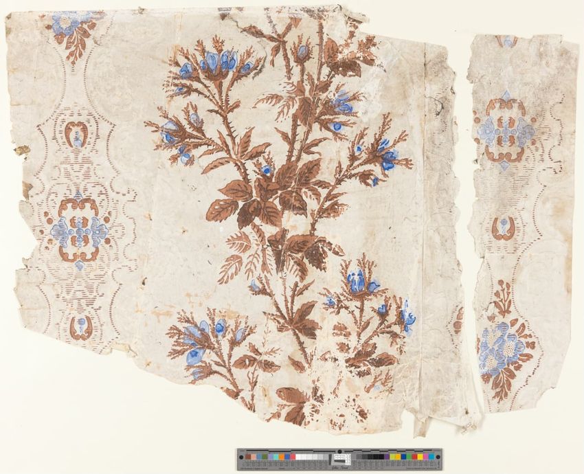 Wallpaper fragments. Vertical curvilinear stripe with stylized floral ornament. Scrolls surround it. In between stripes is a long vertical rose vine or branch. Printed in two blues, two browns on white ground.