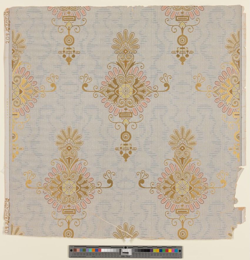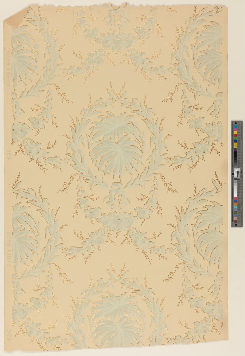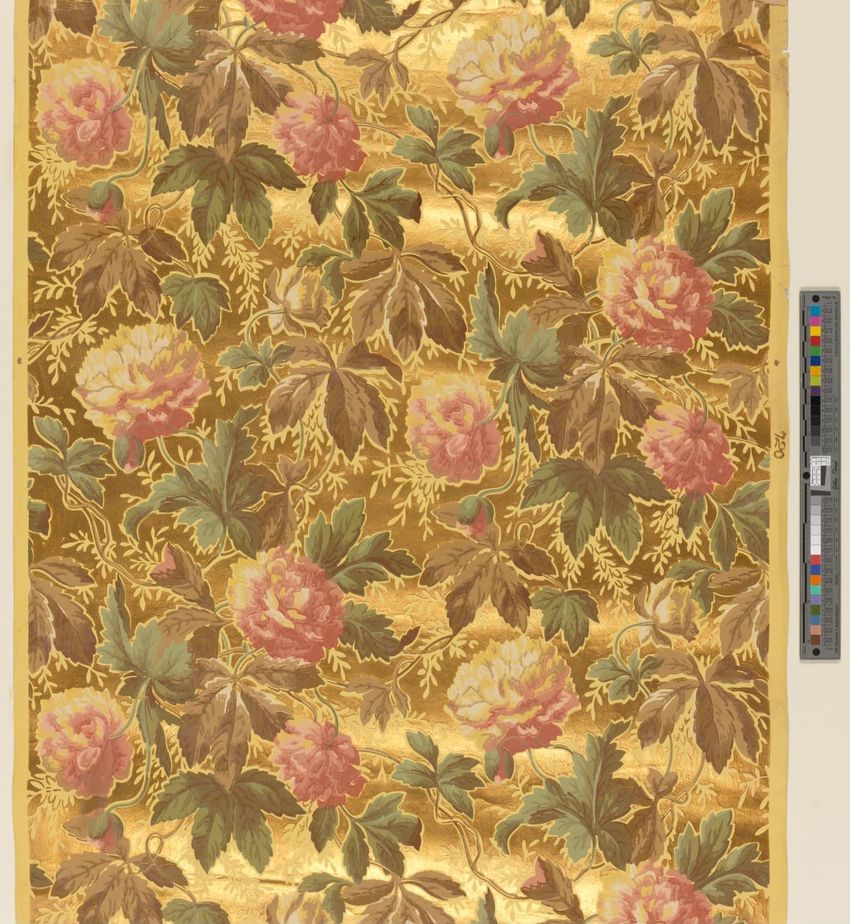 Unused sample. Sprays of roses, lilacs, irises and phlox with scrolling foliage supporting swagged drum and horn, lute with wheat and a flower basket. Printed in pink, salmon, rust, maroon, olive green, light blue, blue and tan on a beige ground.