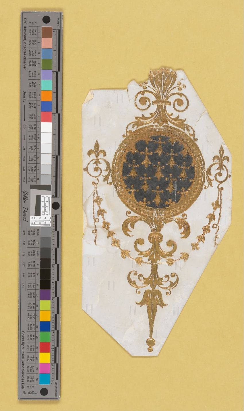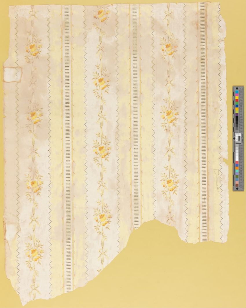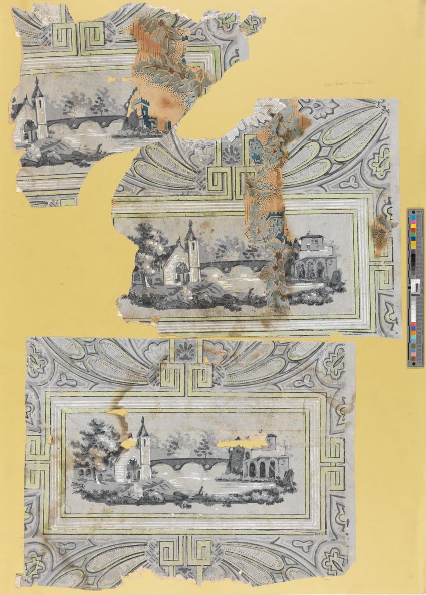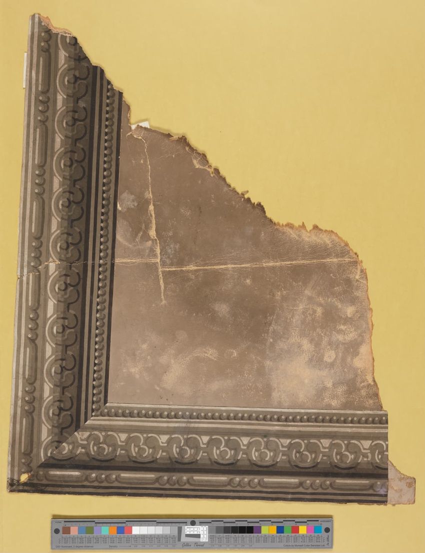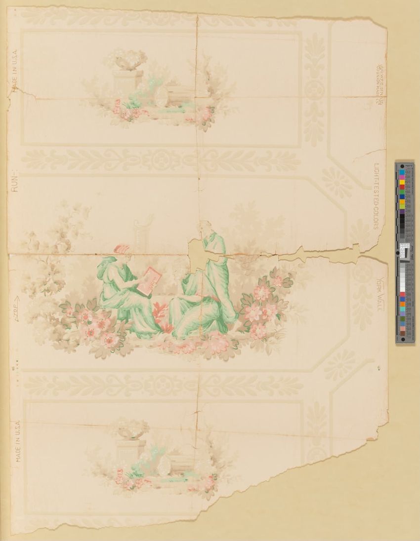 Unused sample. Four spandrels form circular panels of fresco paper or ceiling paper. Corner sprays connected to berried vines with grisaille beaded moulding. Printed in two purples, lavender, red, rose, two pinks, three greens, tan, white and two greys on polished white ground.
