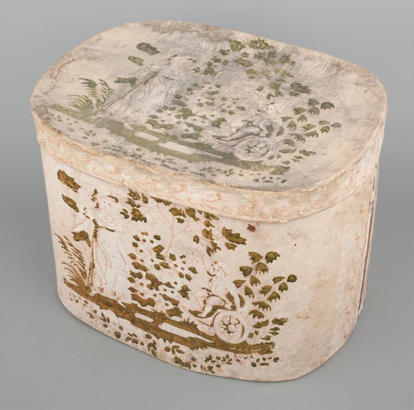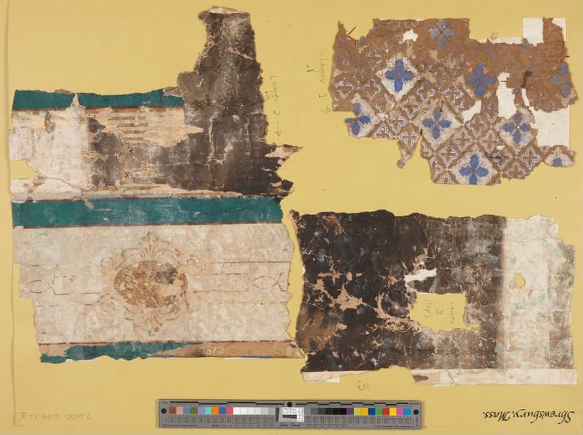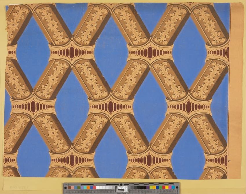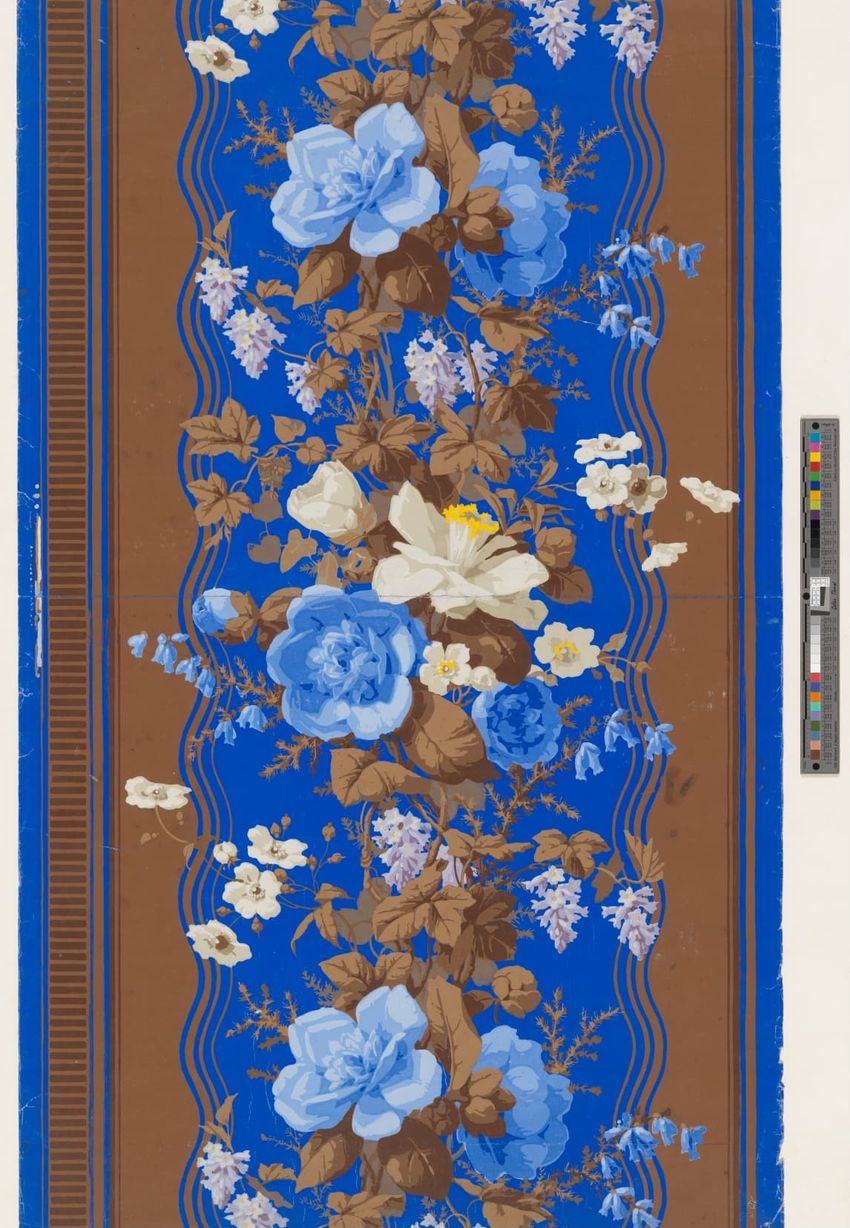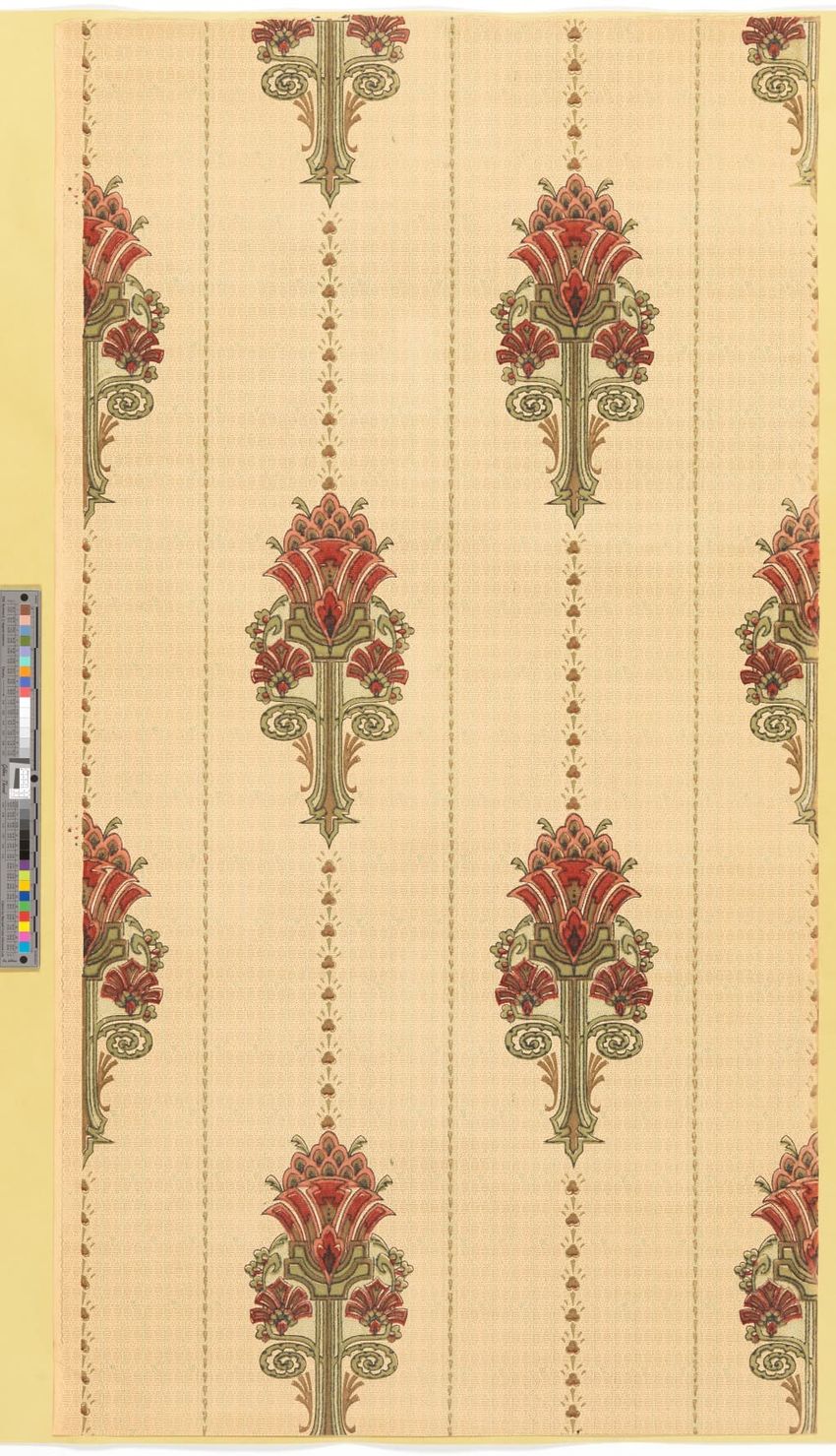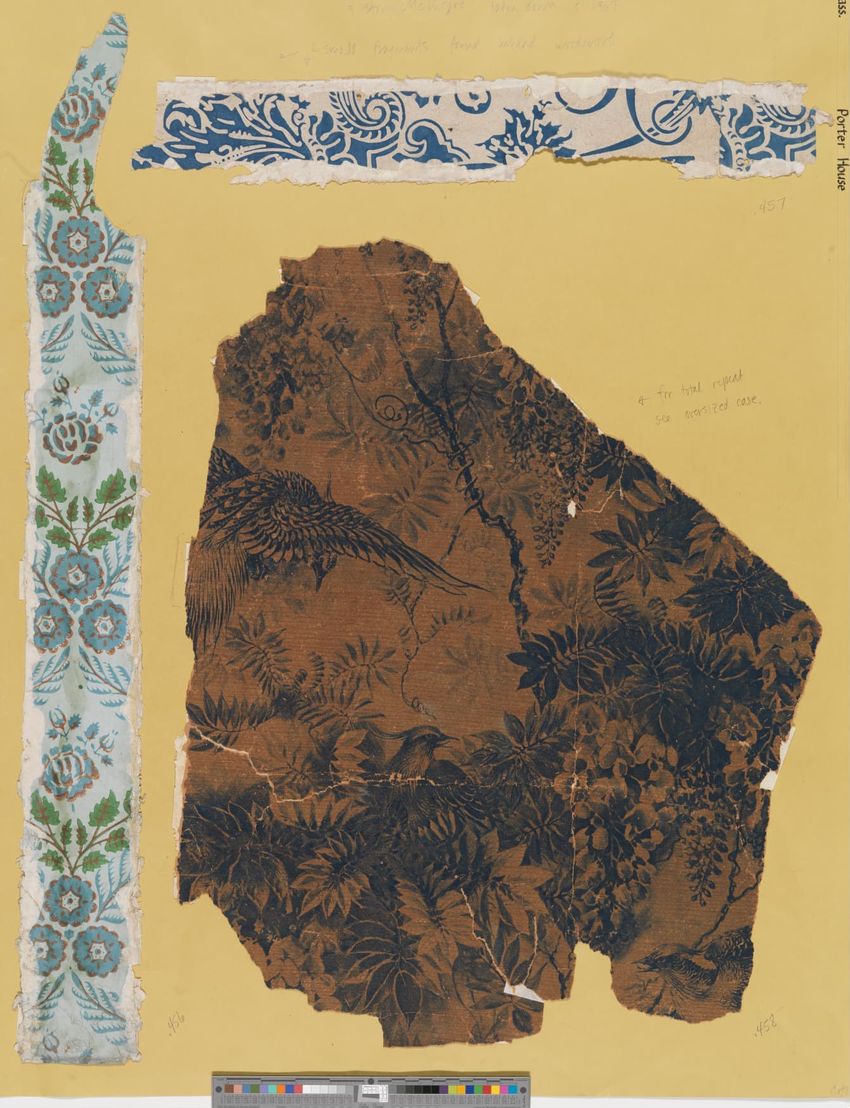 Unused sample. Four spandrels form circular panels of fresco paper or ceiling paper. Corner sprays connected to berried vines with grisaille beaded moulding. Printed in two purples, lavender, red, rose, two pinks, three greens, tan, white and two greys on polished white ground.