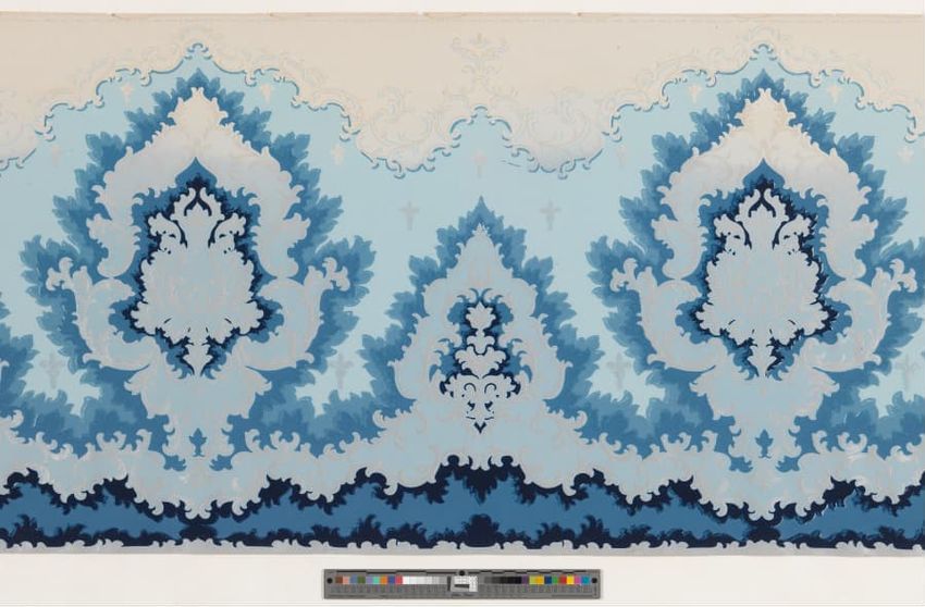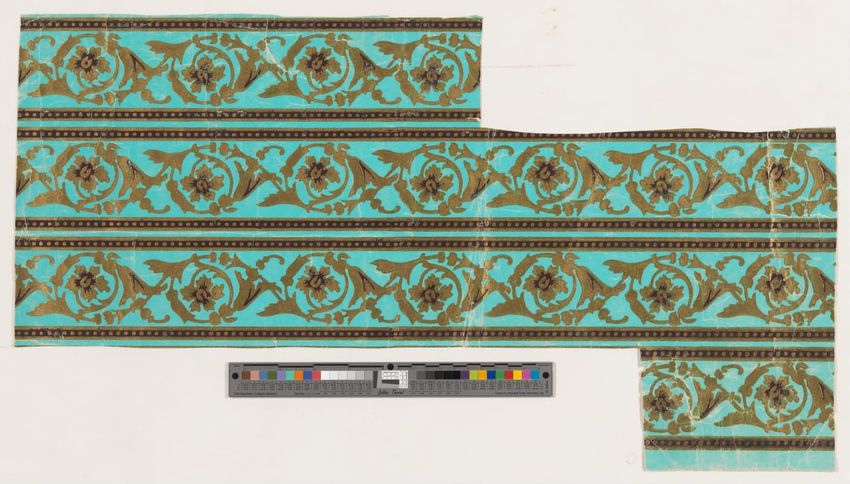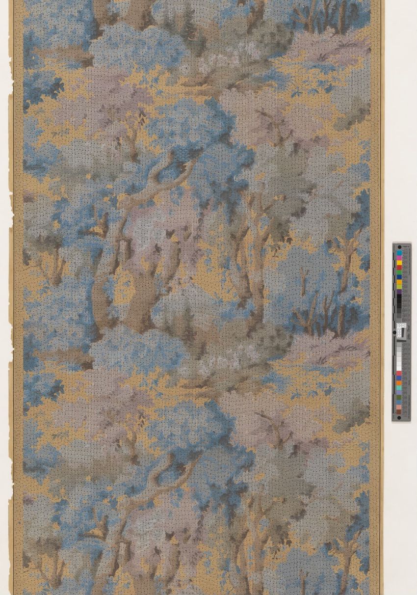 Unused sample. Landscape figure paper. Repeating vignette of maid and gentleman meeting over water pump; surrounded by lush greenery and flowers. Prints in grey, two browns, mauve, three greens, red, pink, yellow, cream on grey ground.