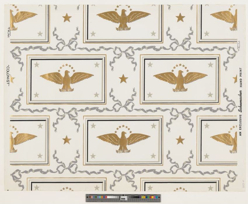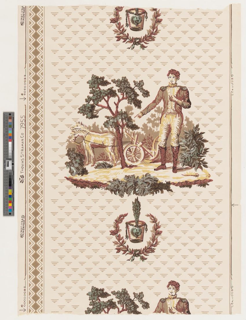 Unused roll. Chinoiserie inspired paper. Large-scale octagons framed with scrolling leaves and inset with a vase and a grouping of fruits and flowers (peonies, grapes, apricots) with bird and butterfly. Prints in beige, tan, three pinks, two blues, black on white, woven-textured ground.