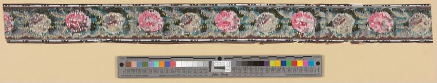 Wallpaper fragment. Renaissance revival strapwork in gray ornamented with pink and red roses and bachelor buttons in brown and blue.