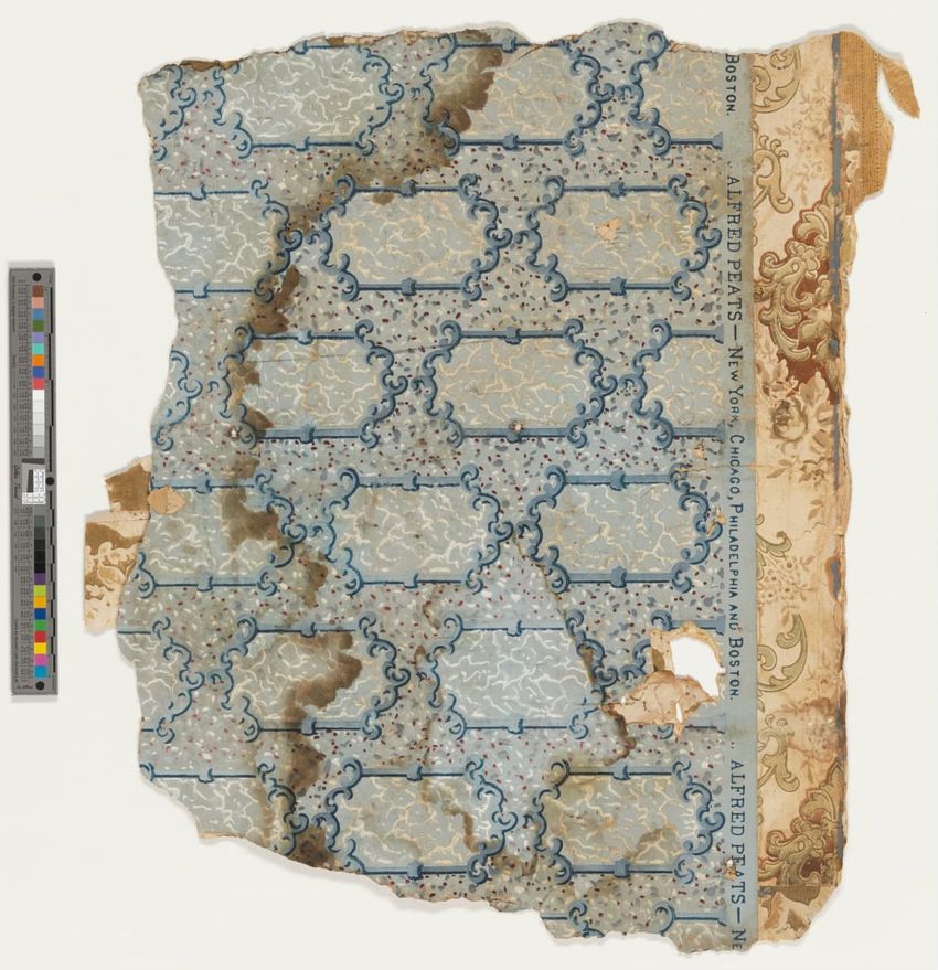 Wallpaper fragment. Pattern of allover quatrefoils, formed by C-scrolls, with diamond centers. Printed in blue, white and brown on unground paper.