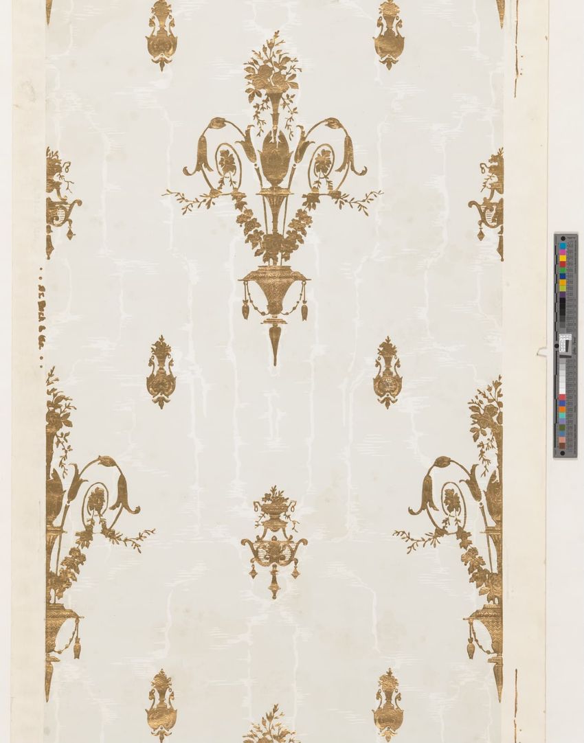 Partial roll. Large, gilt, Neo-Grec elements composed of roses in a rose supported by a cylix, framed by arabesques draped with rose garlands and separtated by smaller gilt rose and urn motifs. Printed against a field of imitation silk moire printed in grisaille.