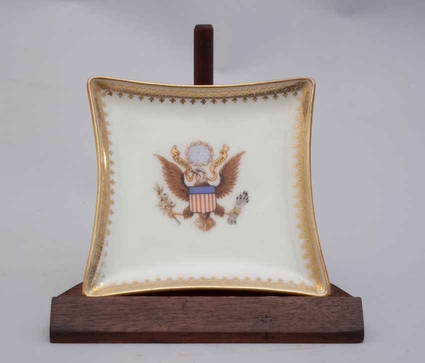 Porcelain square ashtray with a painted splayed American eagle in center with red, white and blue shield on its chest, holding a banner in its beak and an olive branch and arrows in its talons, circle of stars above its head, and a border of gold fluer de lis and scrolls around the inner rim.
