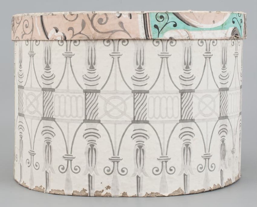 Pasteboard bandbox with lid. Box [A] and lid [B] covered with a block-printed gray geometric design of slim columns with pointed edges repeating in a fence-like pattern on white ground. Larger green and brown columns on either side of box. Lid rim papered in spiral pattern, pink ground. Interior of...