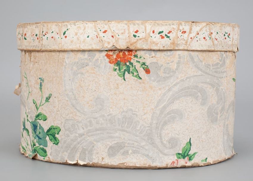 Pasteboard bandbox with lid. The box [A] and lid [B] are covered in a block-printed red, pink and green floral wallpaper pattern with gray swirls on cream ground. Box interior is lined with white paper. Lid rim is an undetermined red and green floral pattern with white ground. Visible stitching a...