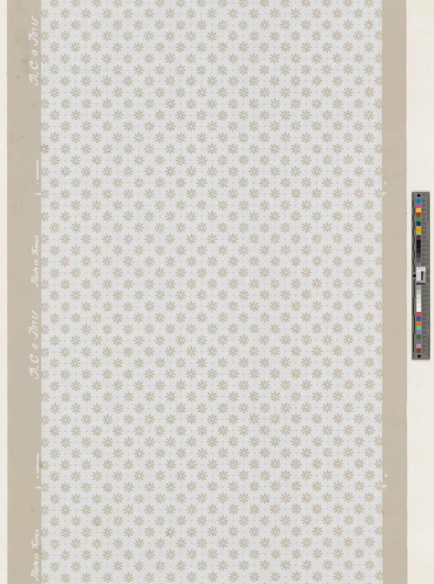 Unused roll. Lattice-work pattern printed in two grays and cream on beige ground. Straight repeat.