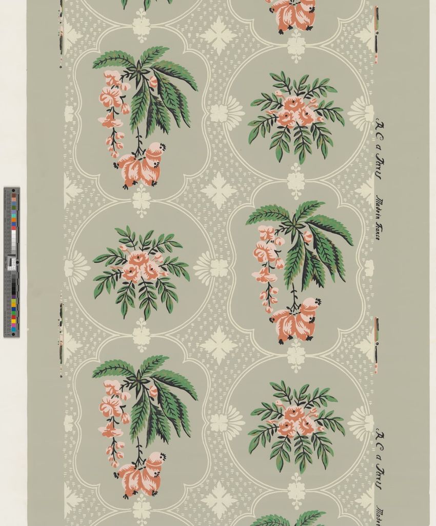 Three unused rolls. Two alternating floral vinettes framed by double white borders with a leaf medallion and small pinpoint geometric design backdrop. Printed in green, black, two pinks, and white on gray ground. Straight repeat. End of roll.