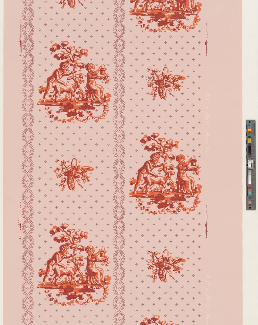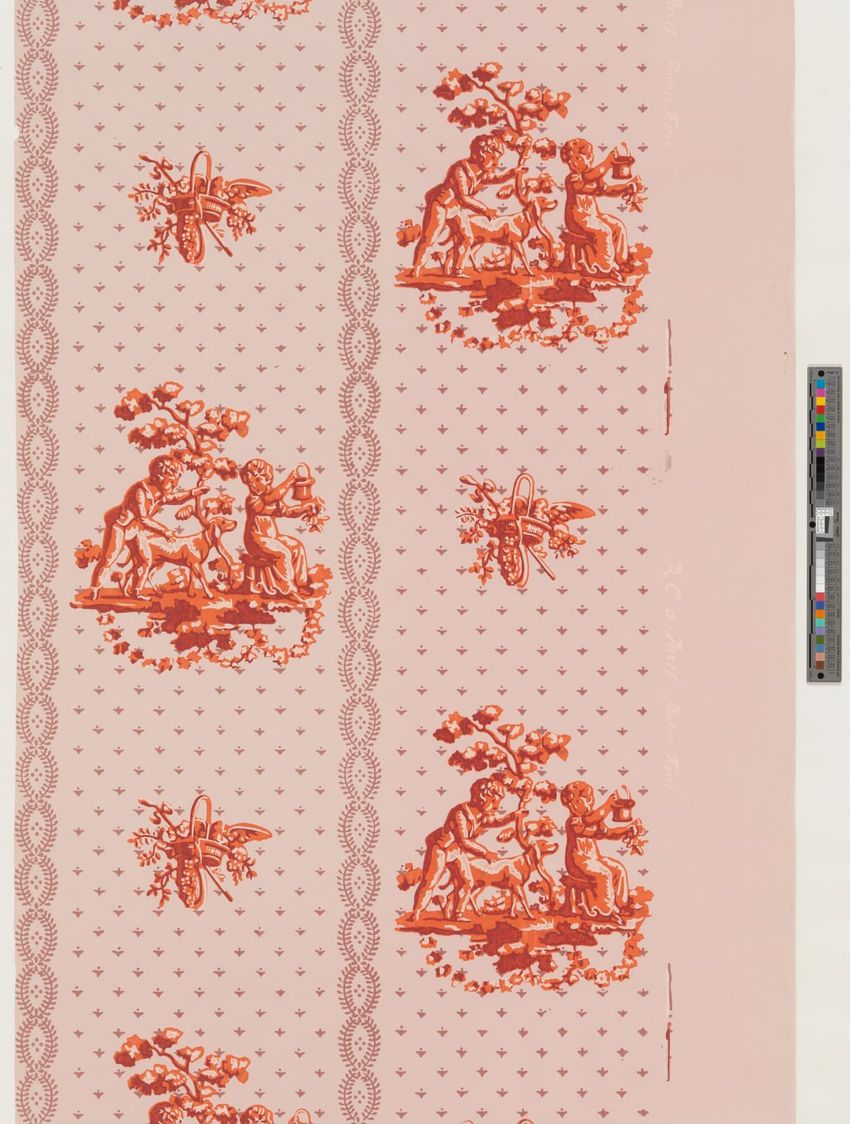 Unused roll of wallpaper. Pattern composed of figurative vignette of a male and a female child with dog alternating with basket of flowers primarily in red-brown and orange. Diaper pattern background and vertical stripe in a loral leaf motif in mauve. Printed on pink ground. Straight repeat. Pin ho...