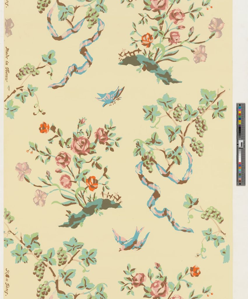 Two unused rolls of wallpaper. Pattern composed of grapes on vine with ribbons alternating with rose bush. Butterflies and bird fly among the foliage. Printed in three greens, blue, two pinks, orange, brown and mauve on light yellow ground. Straight repeat.
