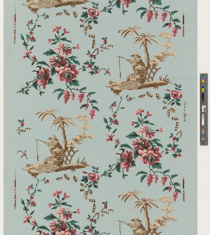 Two unused rolls of wallpaper. Toile de Jouy design executed in this case in polychrome. Vignettes of a Chinese fisherman under a palm tree alternating with a floral sprig. Printed in red, pink, green, two browns, tan and beige on a green ground. Straight repeat. Pin holes visible.