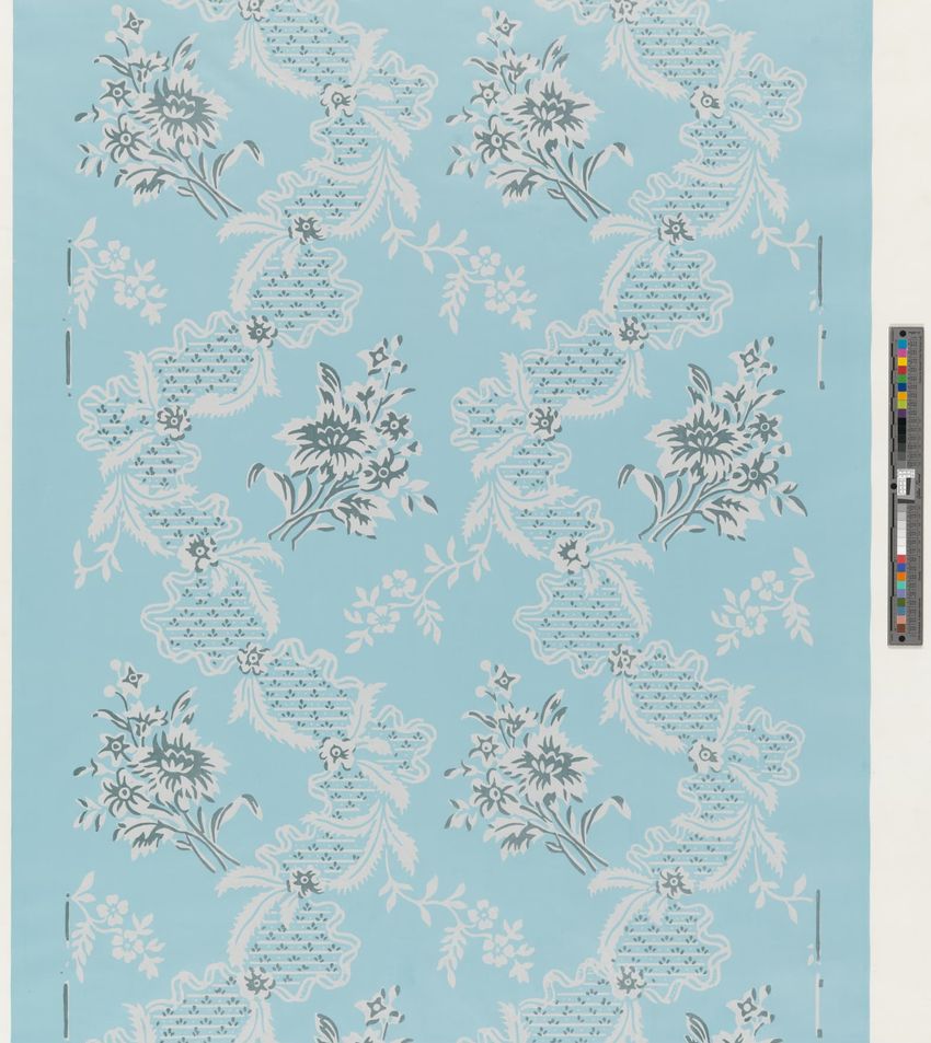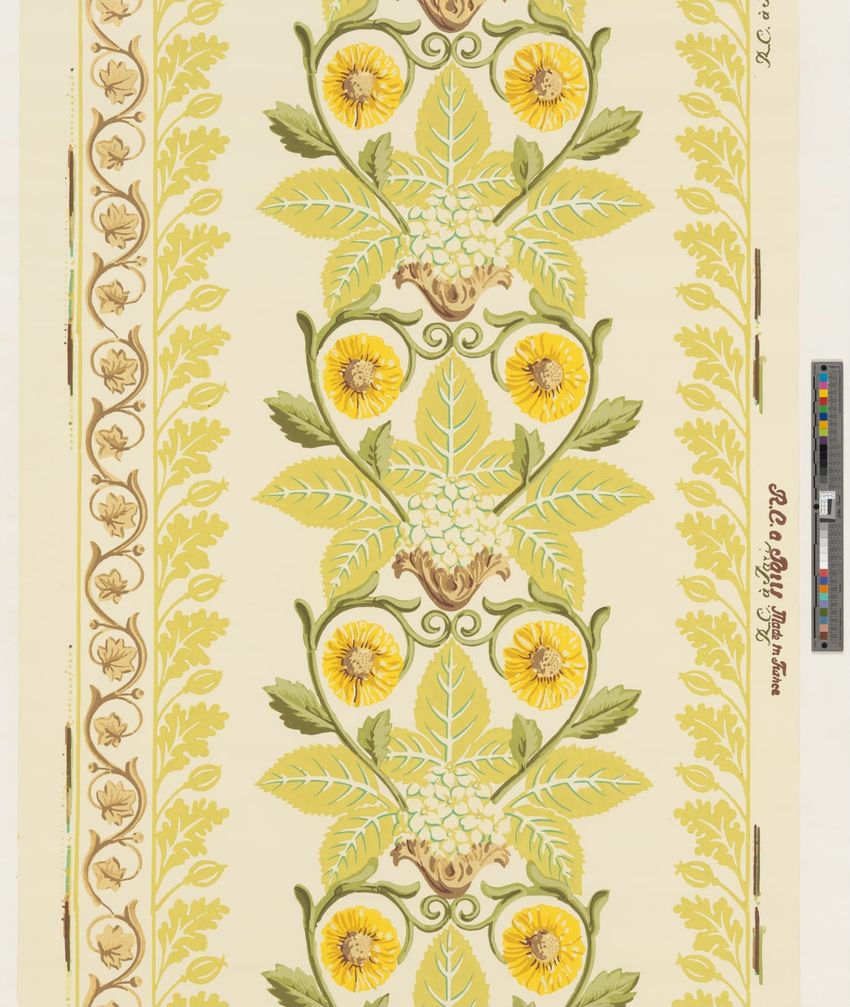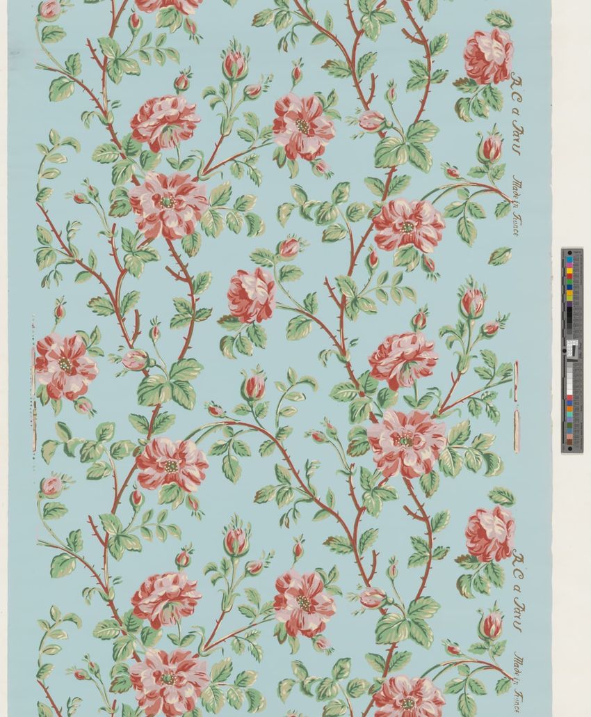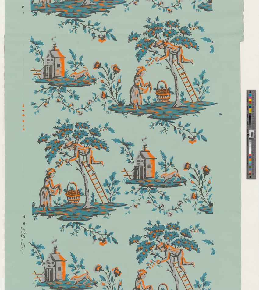 Unused roll. Chinoiserie inspired pattern composed of meandering vine with pomegranate, pineapple, flowers, butterfly, and parrot. Printed in two greens, red, pink, mauve, brown, tan, two blues on light green ground. Pin holes visible. End of roll.