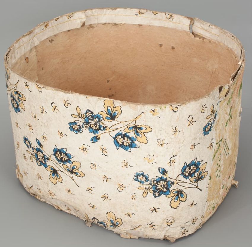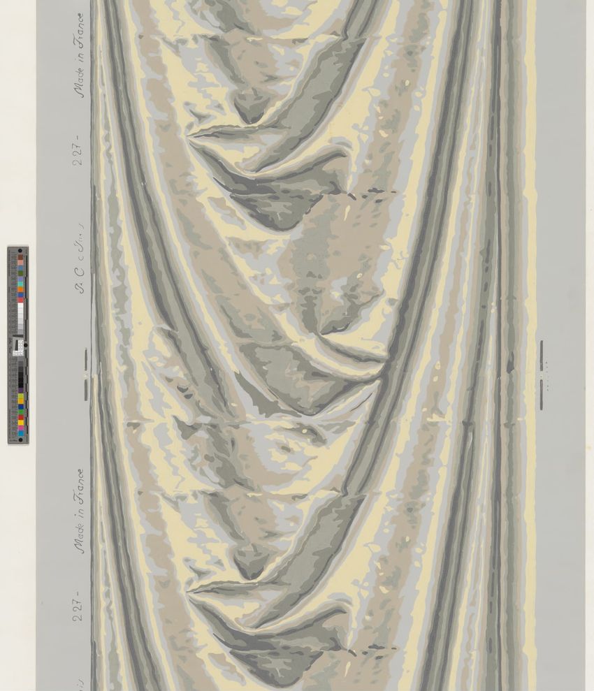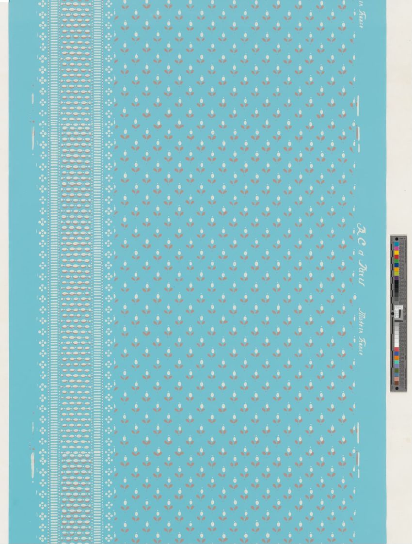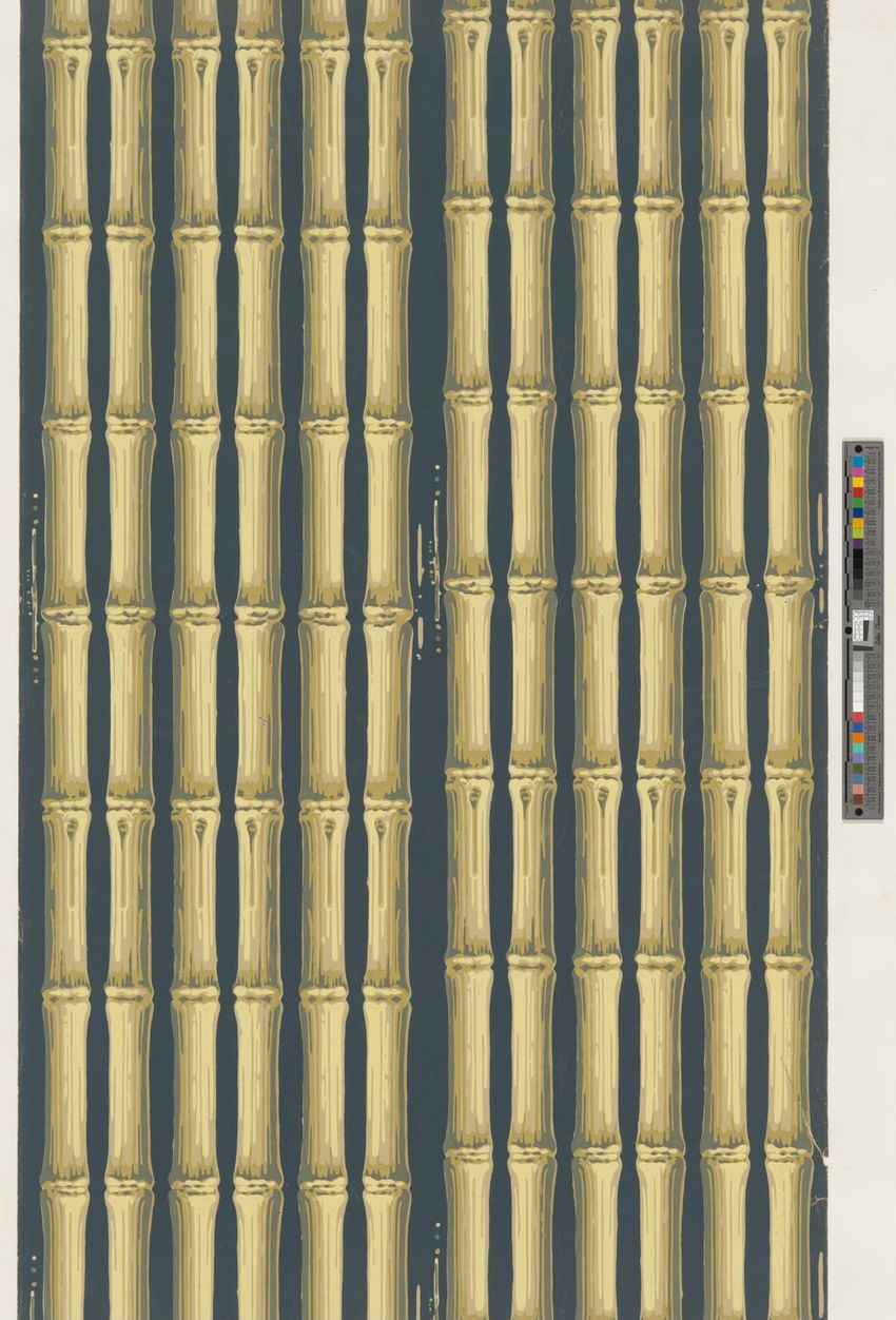Unused roll. Chinoiserie inspired pattern composed of meandering vine with pomegranate, pineapple, flowers, butterfly, and parrot. Printed in two greens, red, pink, mauve, brown, tan, two blues on light green ground. Pin holes visible. End of roll.