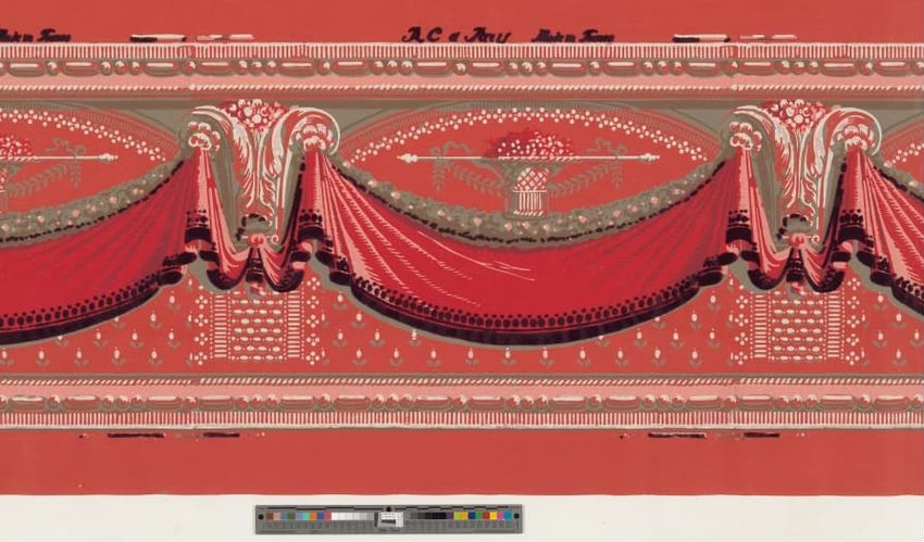 Unused roll. Drapery swag frieze or border edged with bead, cable and dentil stripes. Sprig diapered background. Printed in maroon flock, gray, white, pink and dark red on light red background. Straight repeat. Pin holes are visible.