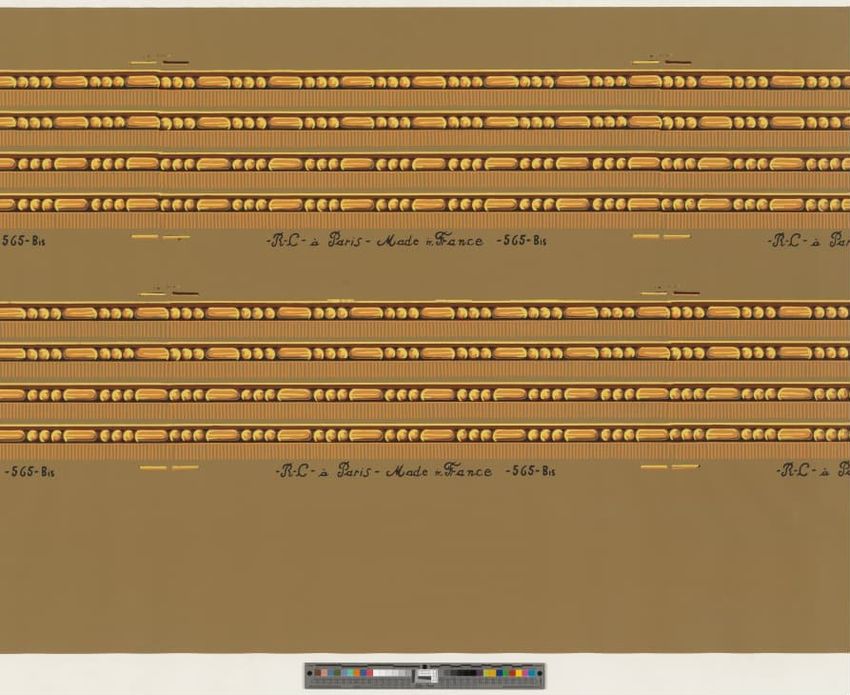 Unused roll of border paper. Two rows of four uncut borders printed on the roll. Pattern of bead and reel with dentil motifs. Printed in orange, brown, yellow, on olive ground. Straight repeat.