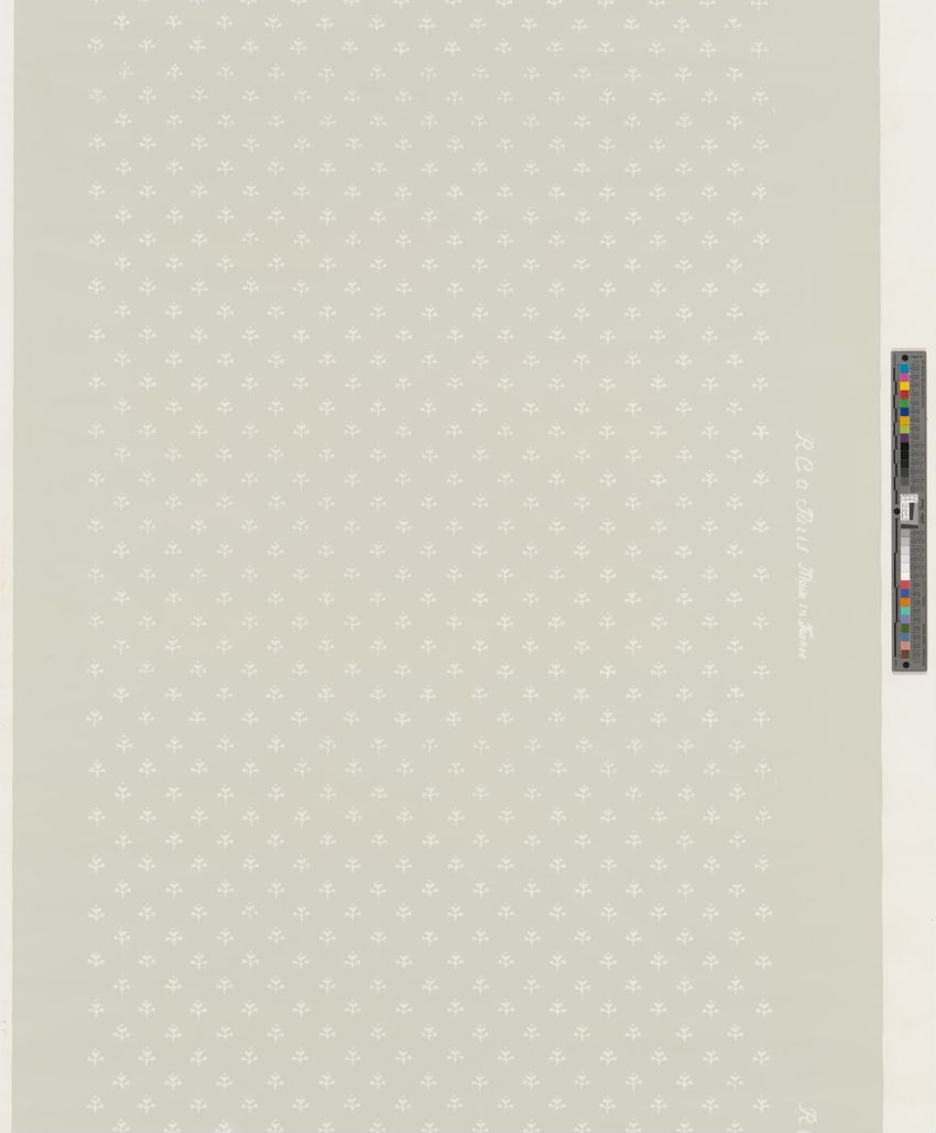 Unused roll. Sprig motif in diaper pattern. Printed in white on gray ground. Straight repeat.