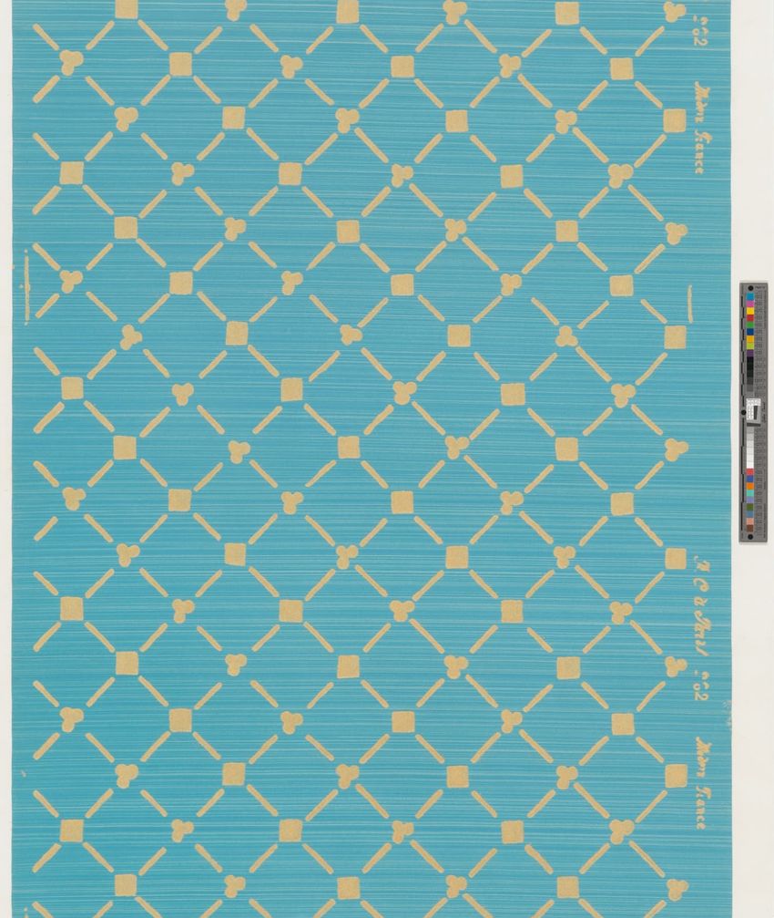 Two unused rolls. Diaper pattern centered on alternating square and clover shapes. Printed in cream flock on blue ground. Straight repeat. Pin holes visible.