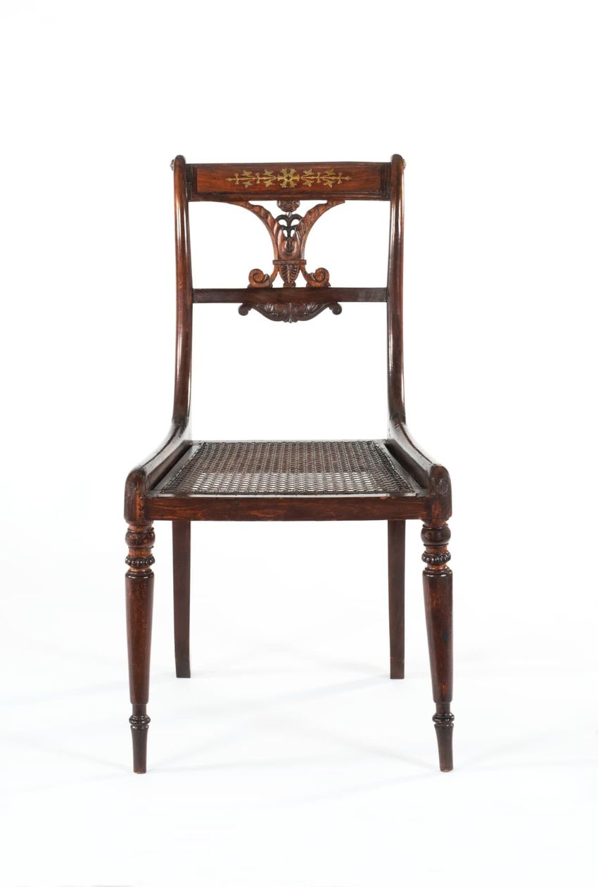 Probably purchased in kit form. Top of needlepoint cushion thumbtacked to plywood underside. Cushion worked in blue with oval floral medallion at center worked in cream, pink, green, and blue. Four sabre legs with roundel on top of stile, molded rails between. Dark stain on wood.