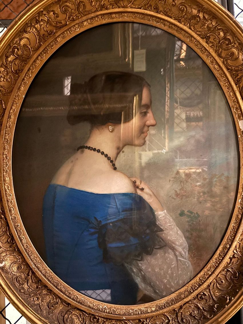 Pewter coffeepot with round body under long and wide cylindrical neck. Domed, hinged lid with knop. Angular handle with balls at each end and at top. Long, curved spout.