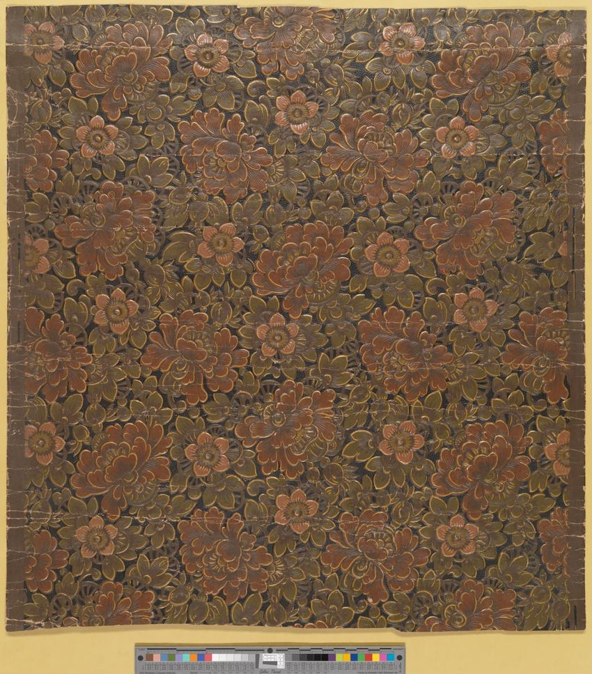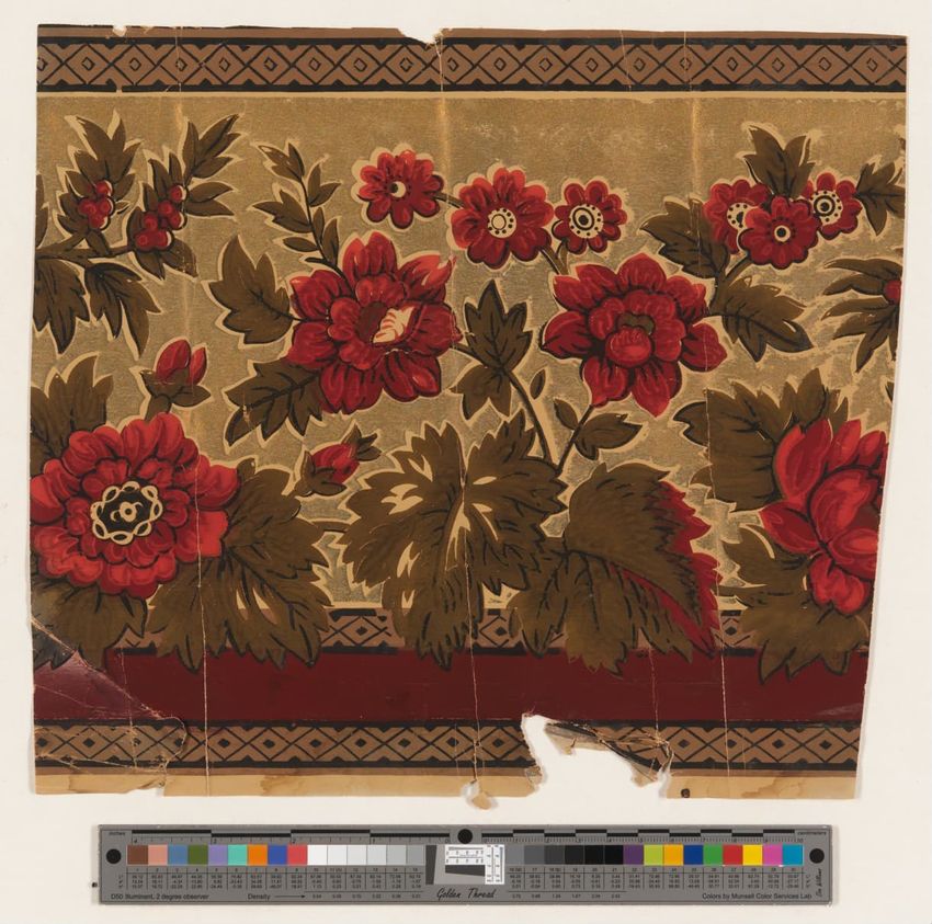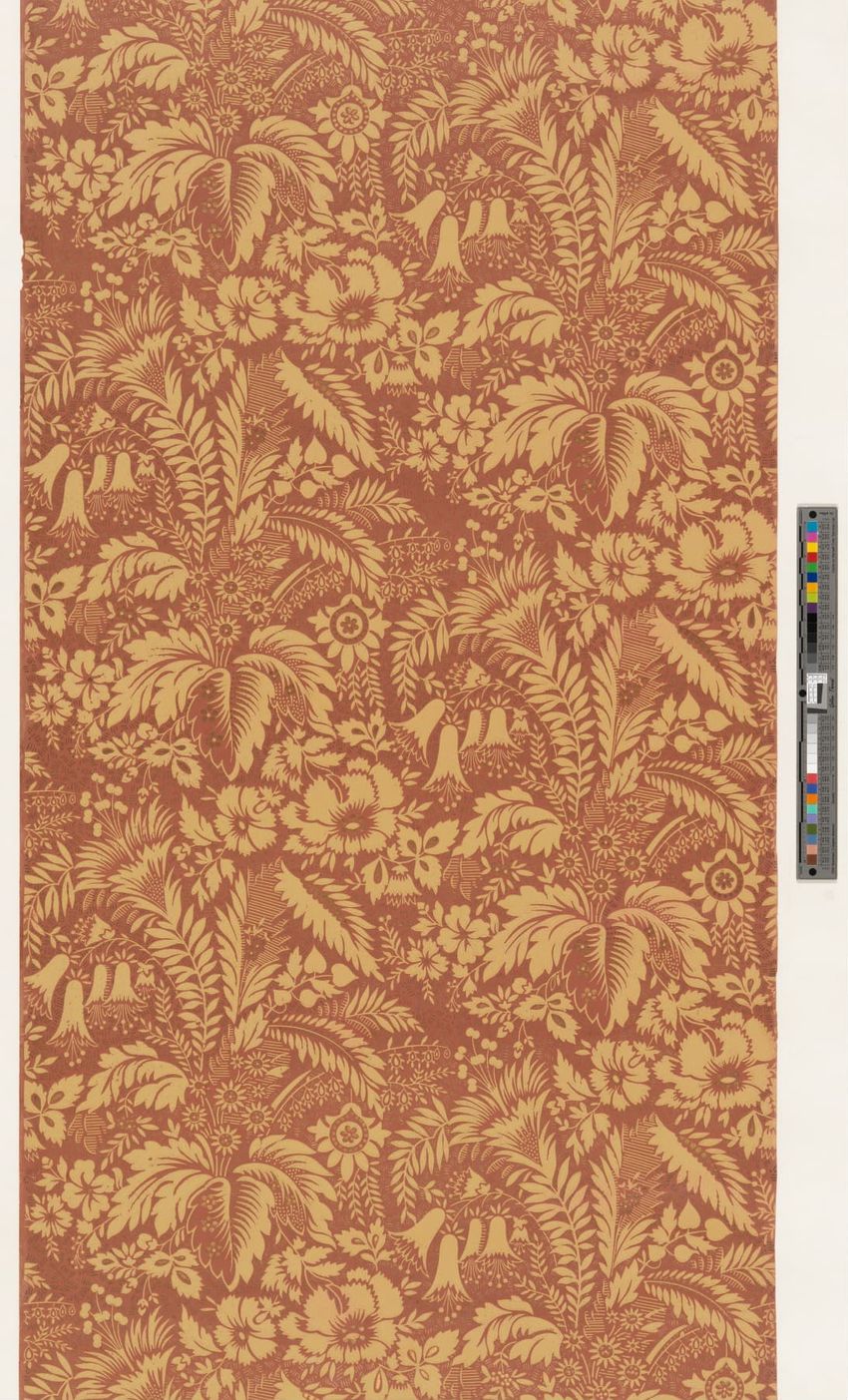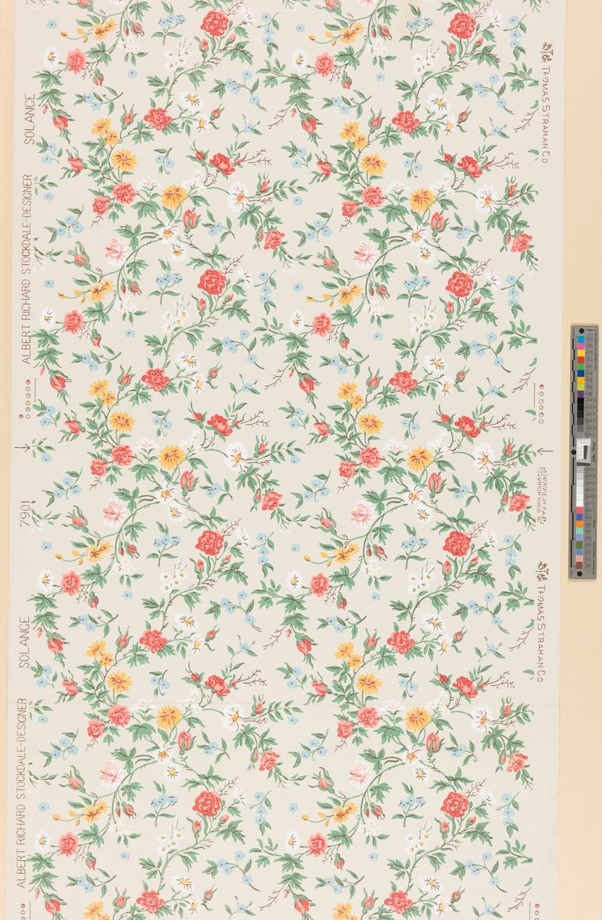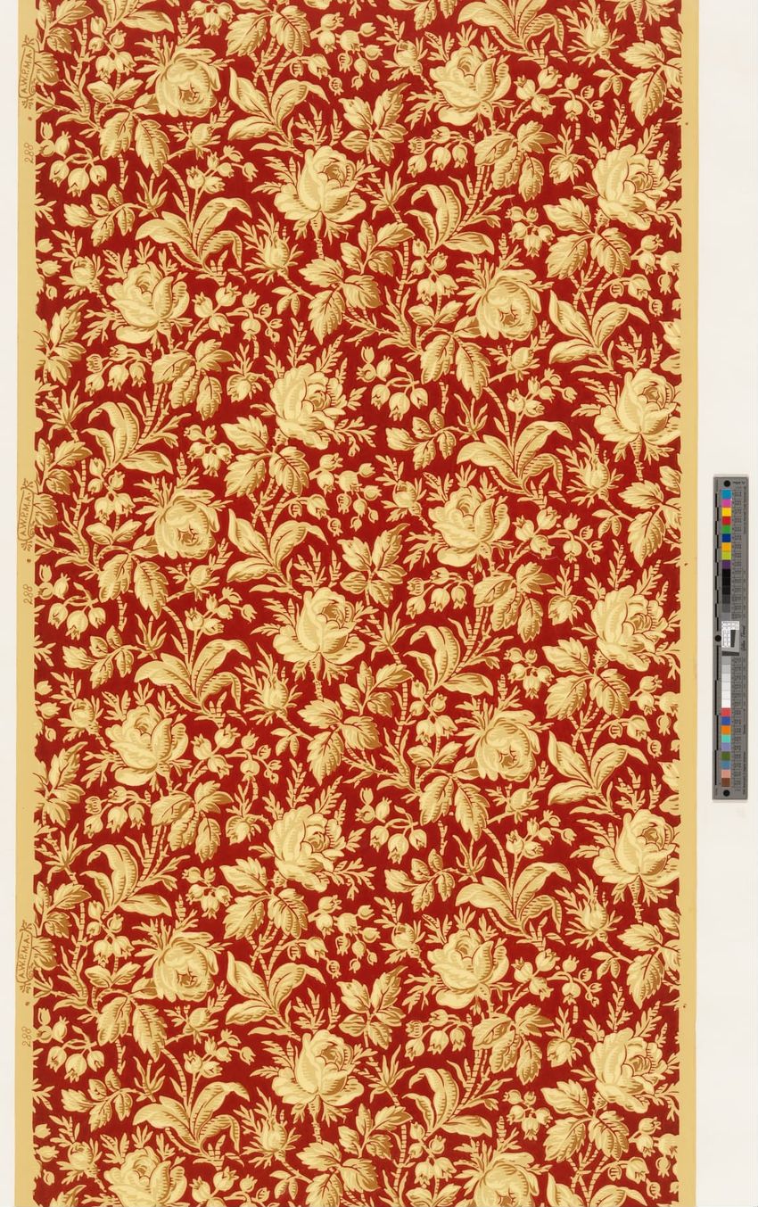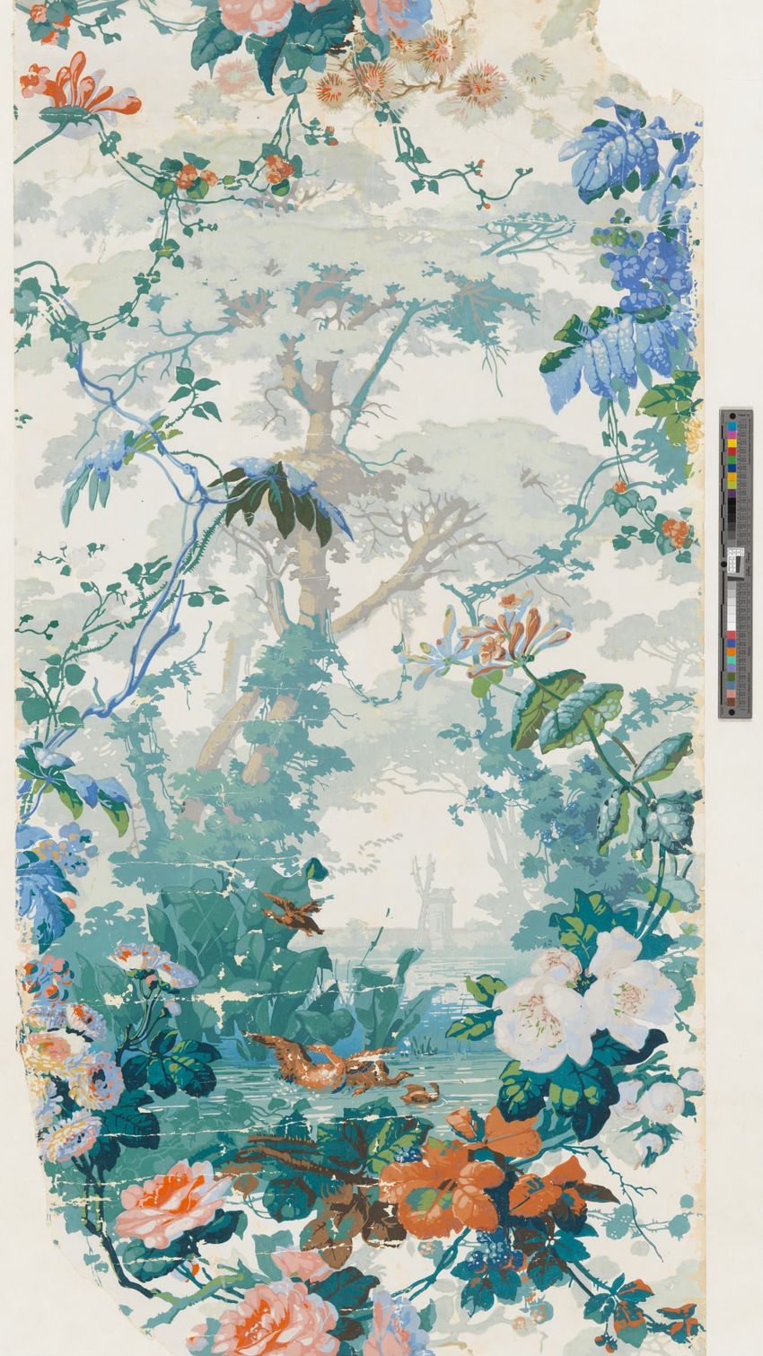 Rolled sample. One panel of scenic paper with a view of ducks in pond in front of a windmill. Scene is framed by overhanging trees, roses and in the foreground, honeysuckle vines. Printed in four blues, seven greens, two greys, brown, tan, burnt sienna, orange, ochre, pink, rose and white.