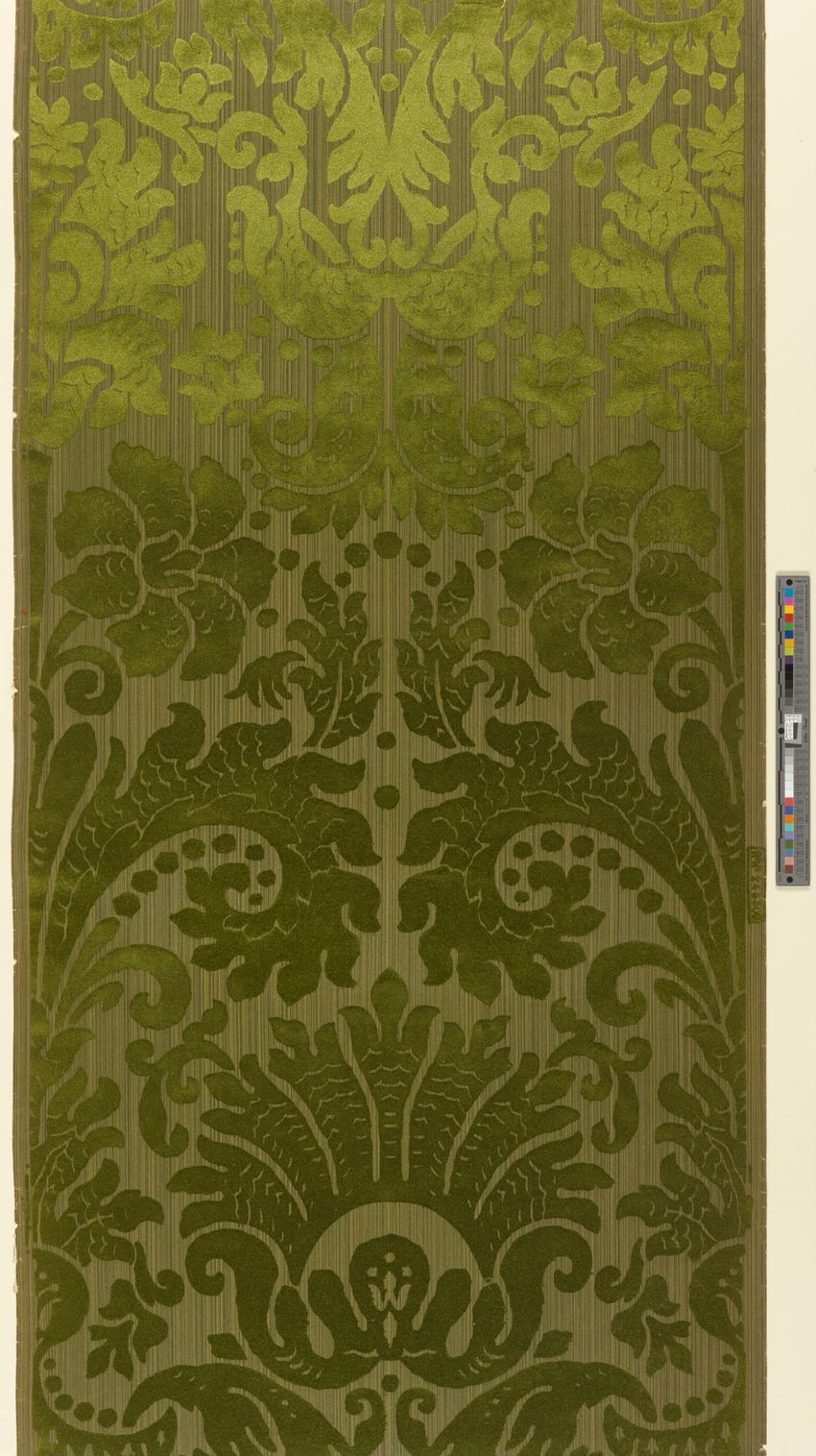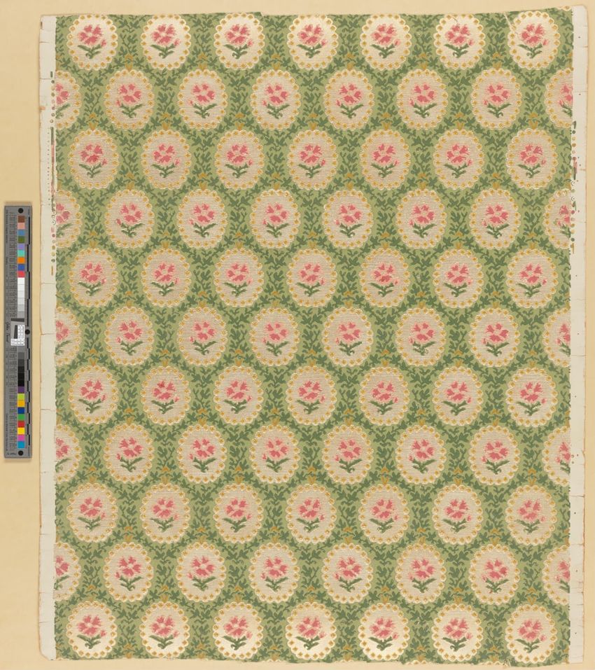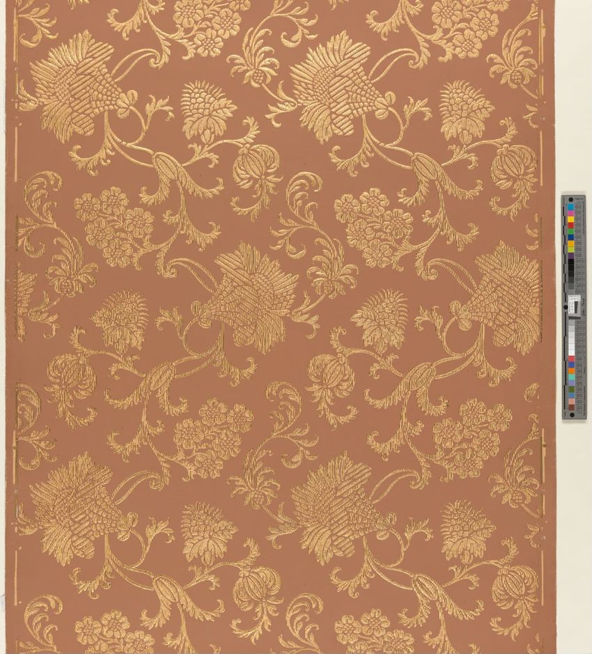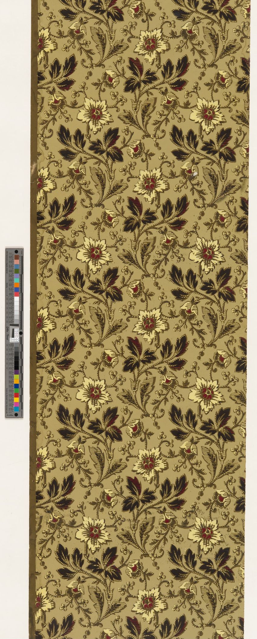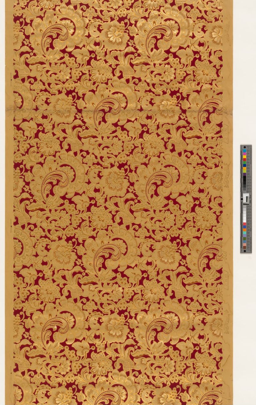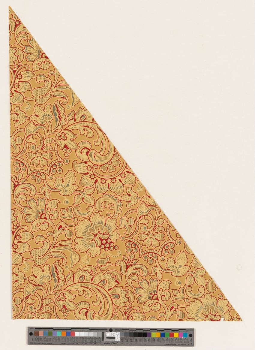 Rolled sample. One panel of scenic paper with a view of ducks in pond in front of a windmill. Scene is framed by overhanging trees, roses and in the foreground, honeysuckle vines. Printed in four blues, seven greens, two greys, brown, tan, burnt sienna, orange, ochre, pink, rose and white.