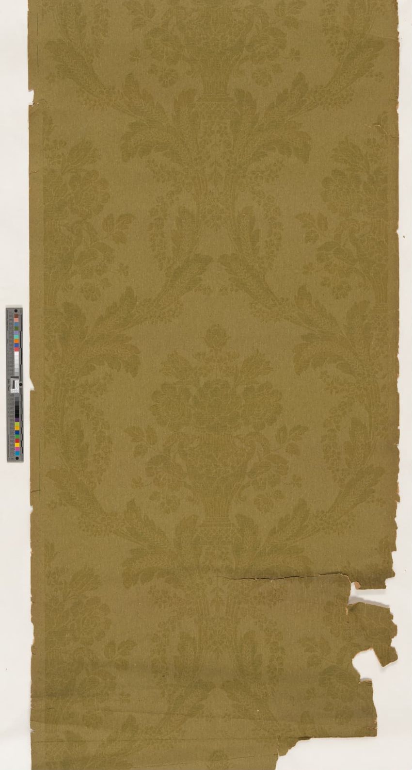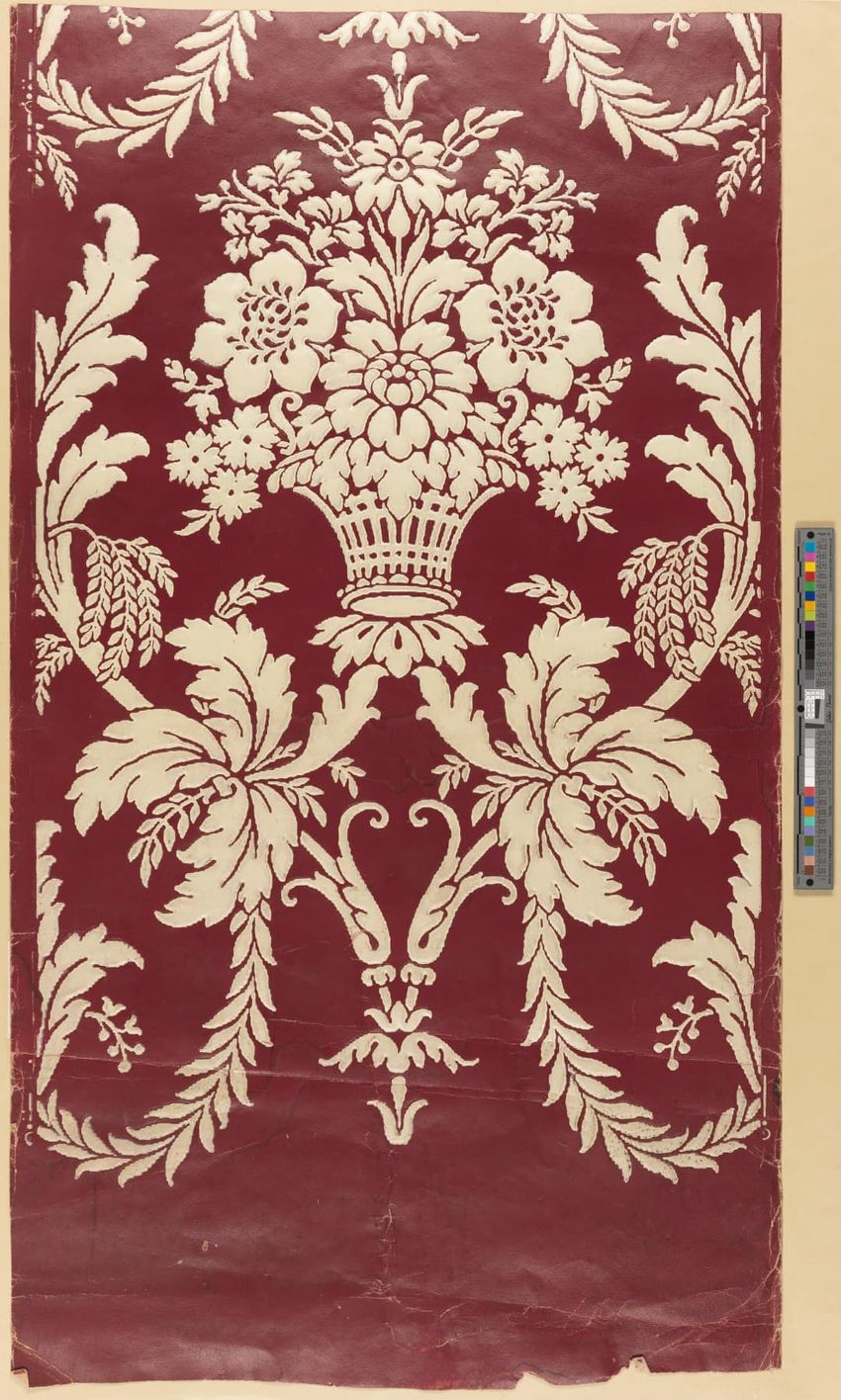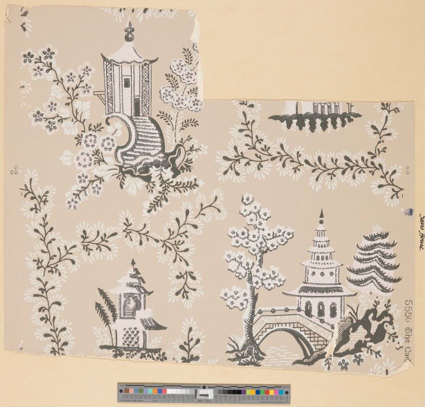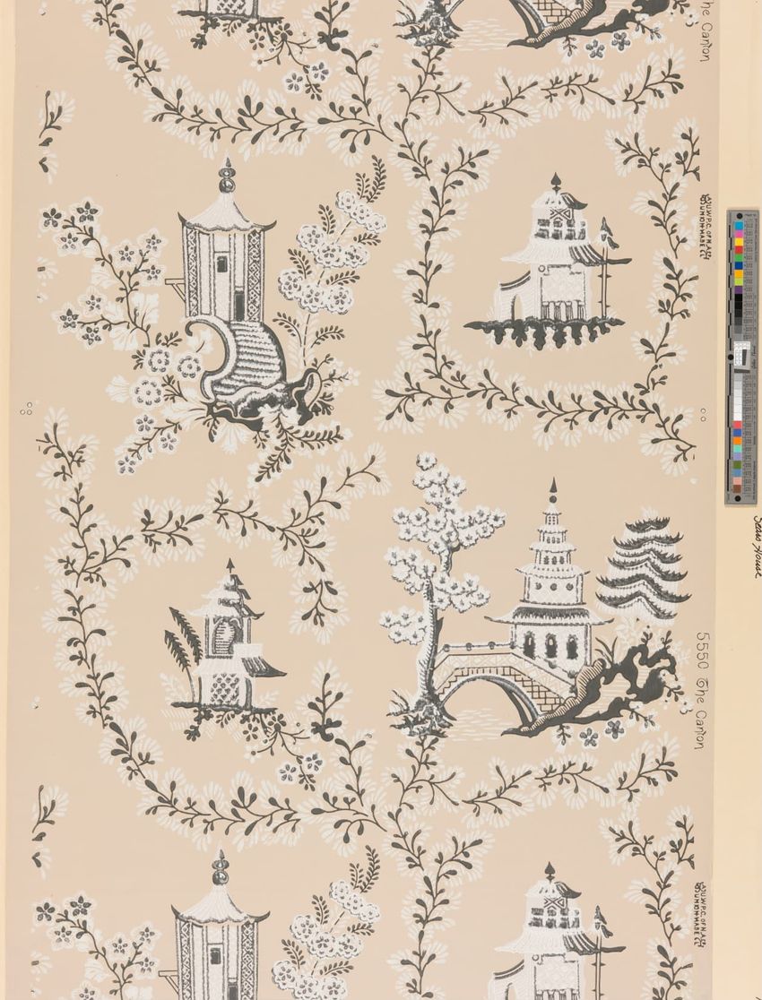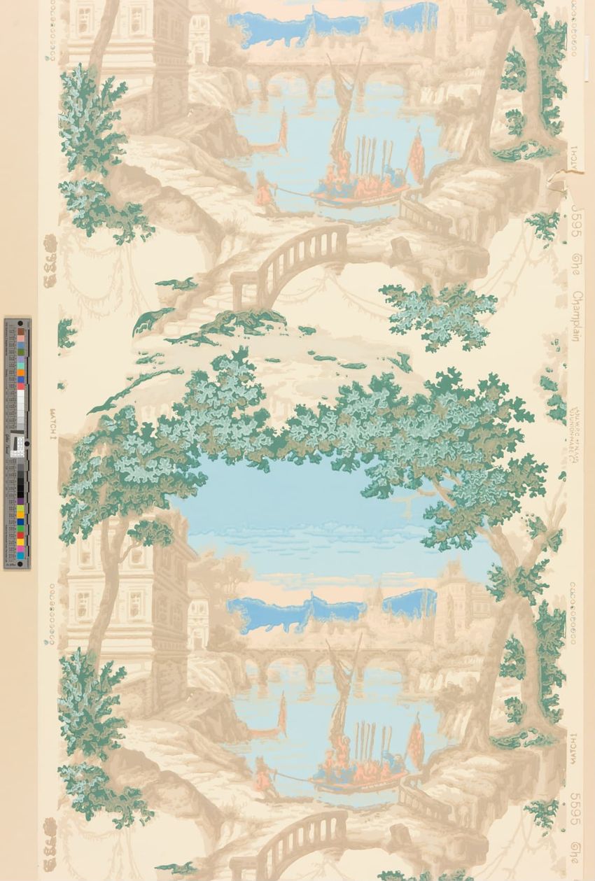 Unused sample. Birds perched in trailing oak branches, with leaves and acorns. Printed in three greens, two browns, two blues, red, three pinks, grey, and yellow on a white, polished ground. Straight match.