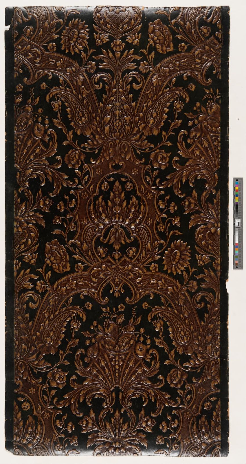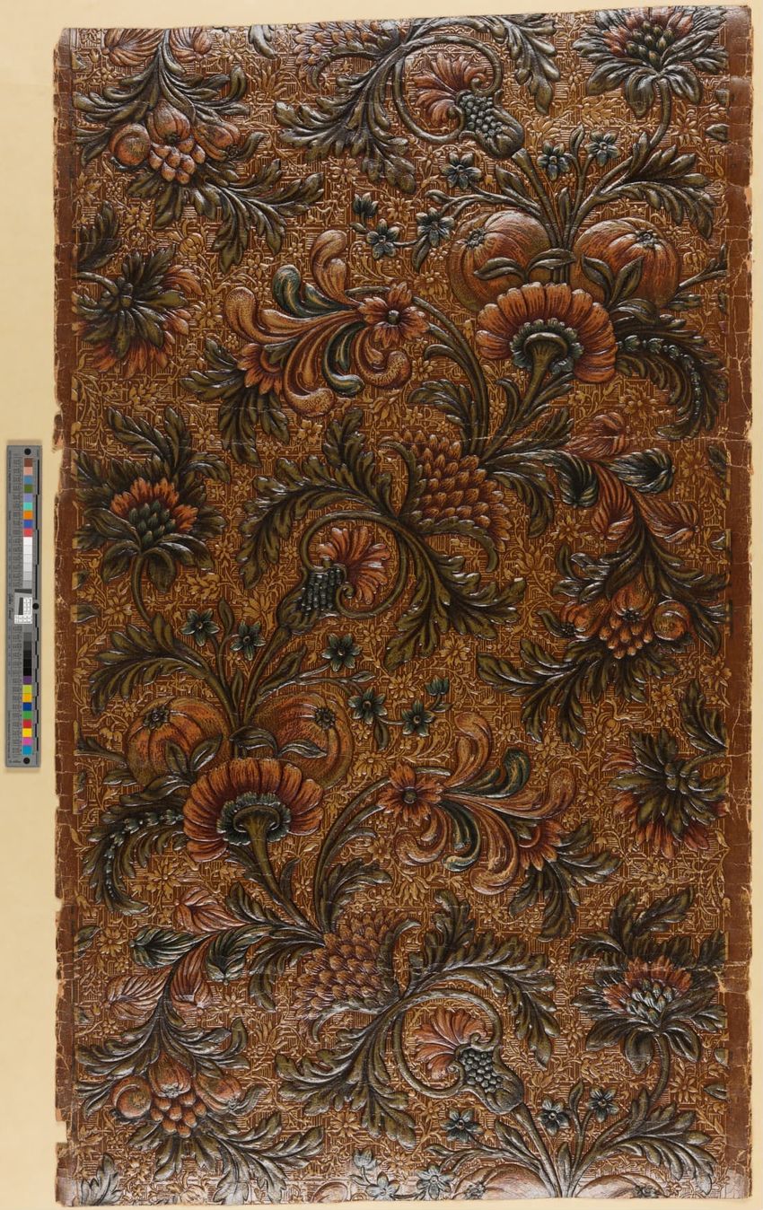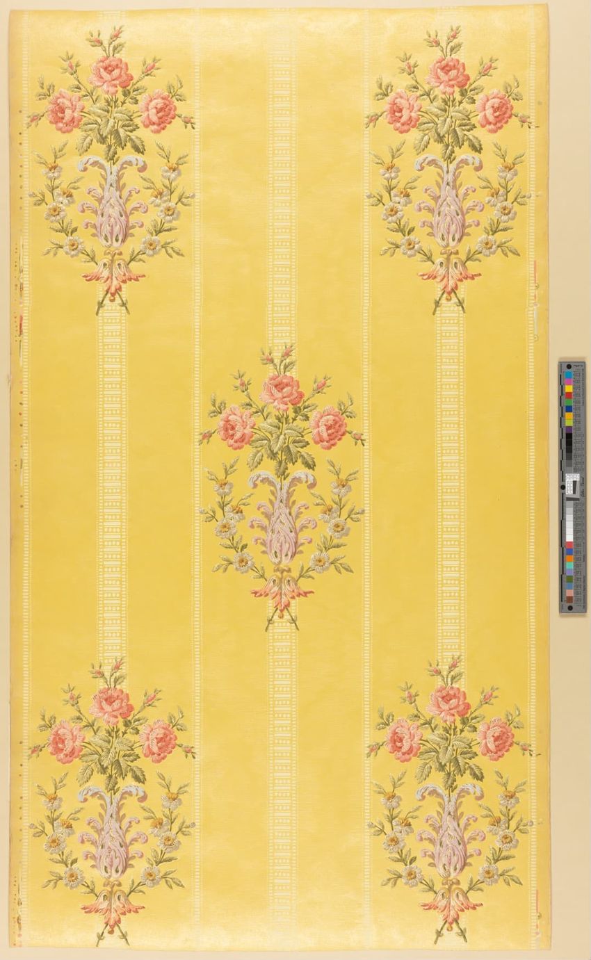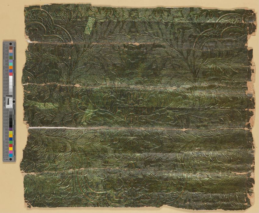 Unused sample. Birds perched in trailing oak branches, with leaves and acorns. Printed in three greens, two browns, two blues, red, three pinks, grey, and yellow on a white, polished ground. Straight match.