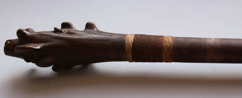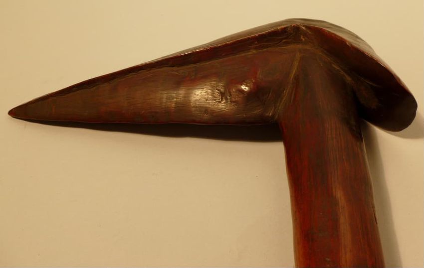 Wooden club with large bird-head shape (porowa ra aru), from New Caledonia. The club head has a large, beak-like projection on one end and a small hooded projection off the other. These clubs, most likely ceremonial, were visual symbols of rank and wealth, and were owned by men of the chiefly class...
