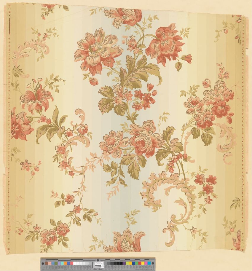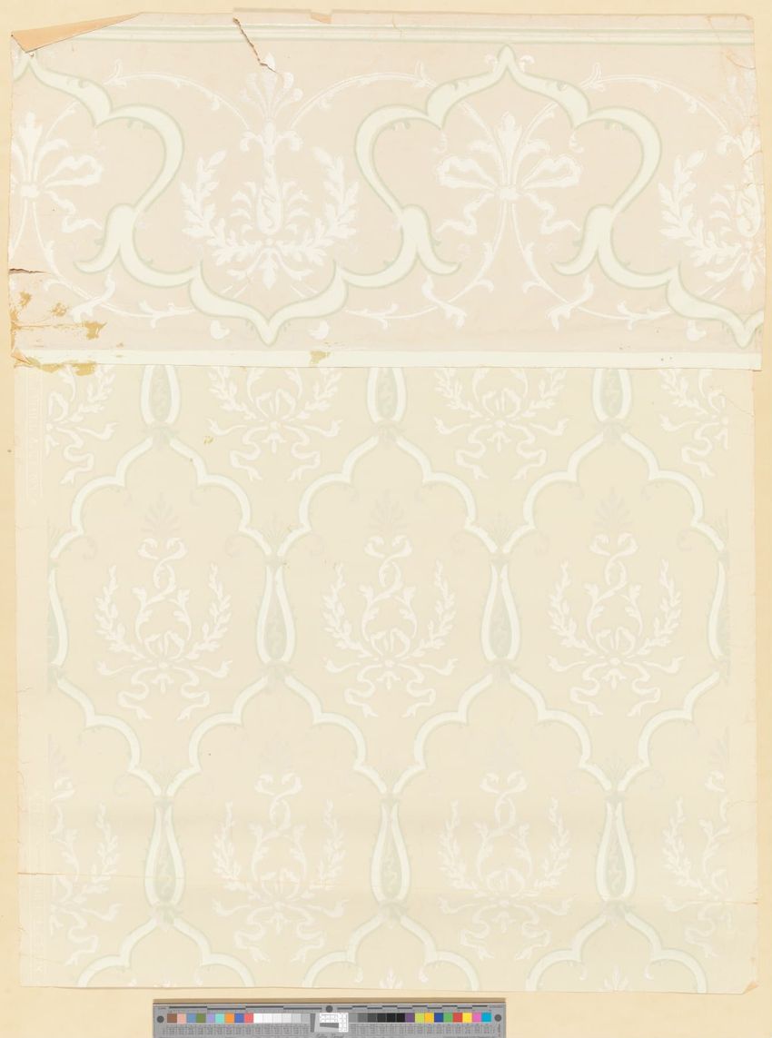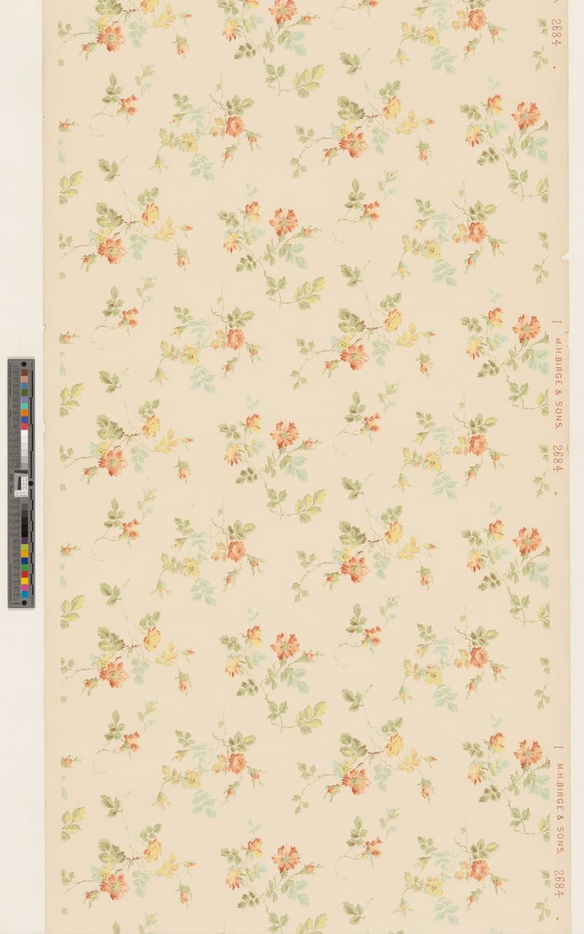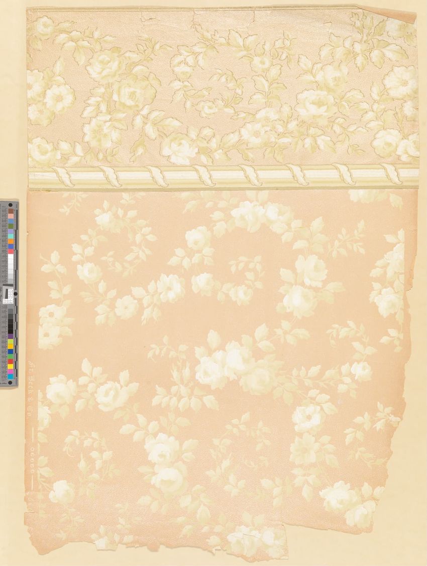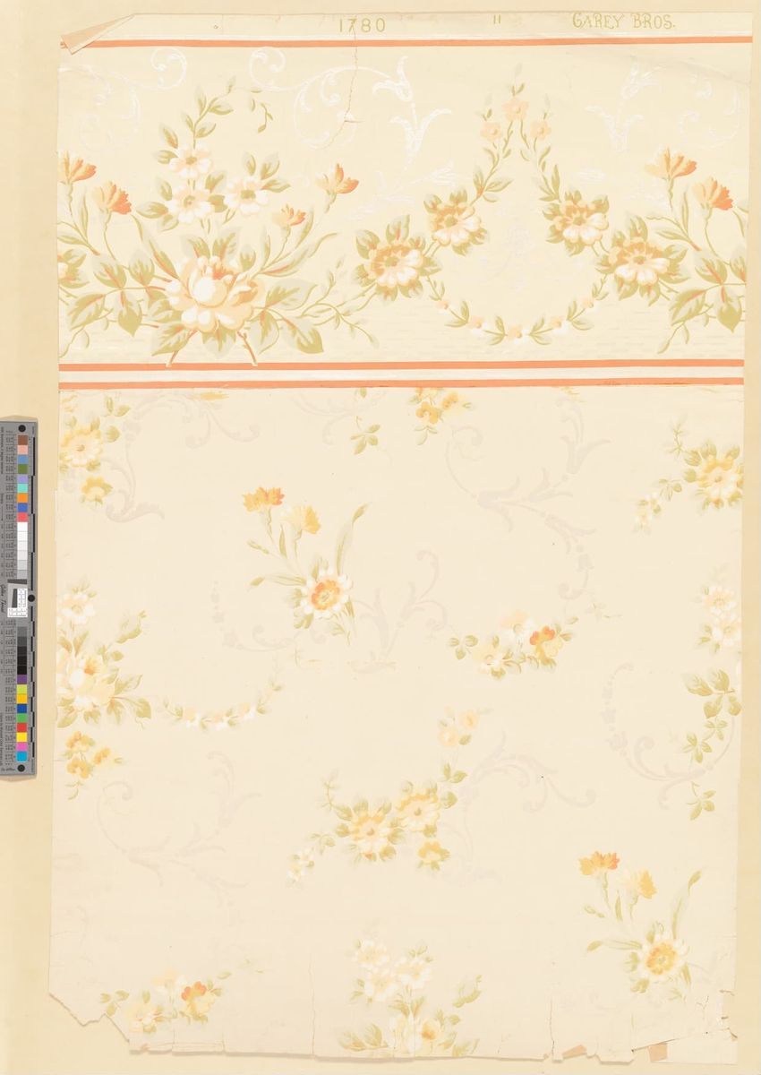 Unused sample with attached border. Flowers and scrolls of lotus leaves, small garlands, bell flowers. Printed in mustard, dark orange, peach, two greens, yellow, white and silver mica on an off-white ground.