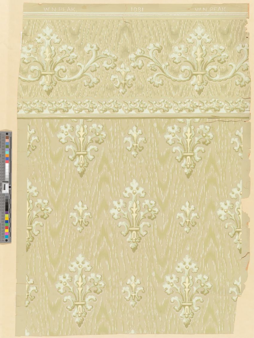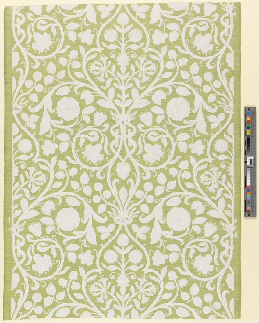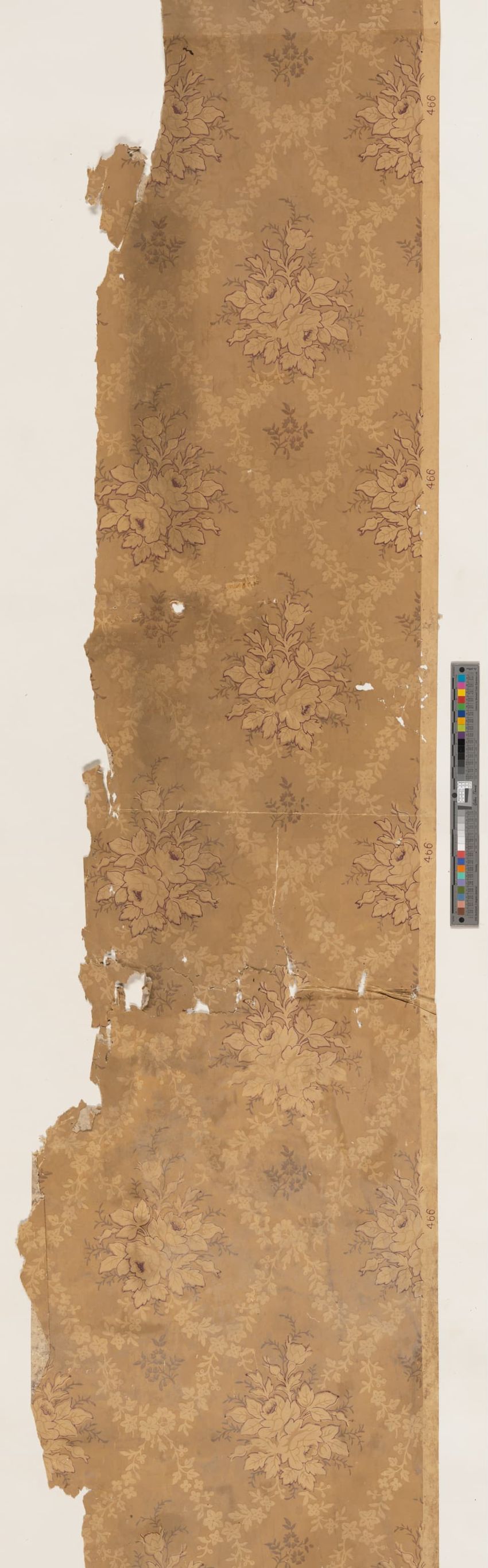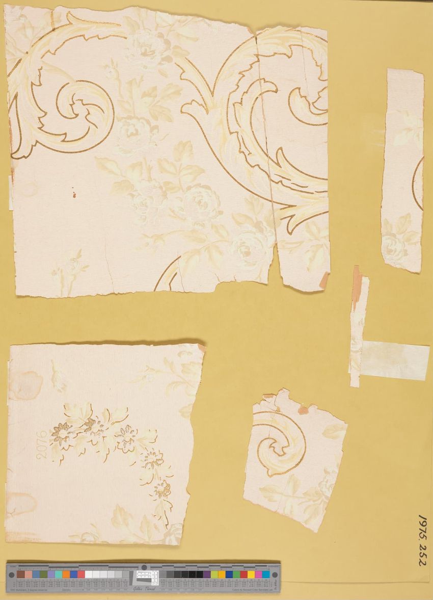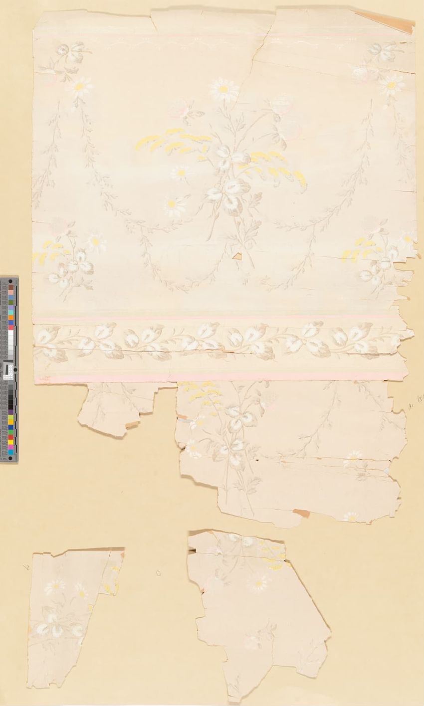 Unused sample with attached border. Flowers and scrolls of lotus leaves, small garlands, bell flowers. Printed in mustard, dark orange, peach, two greens, yellow, white and silver mica on an off-white ground.