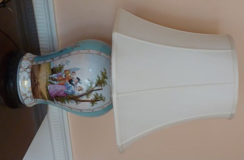Meissen porcelain lamp painted with alternating scenes of flowers and a man and woman in eighteenth century costumes.