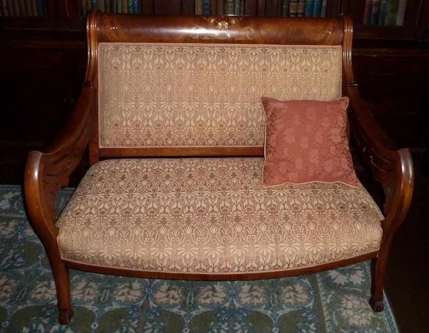 Sofa with upholsterd back and feet; top rail inlaid with mother of pearl and varied woods; arms have open fret pattern.